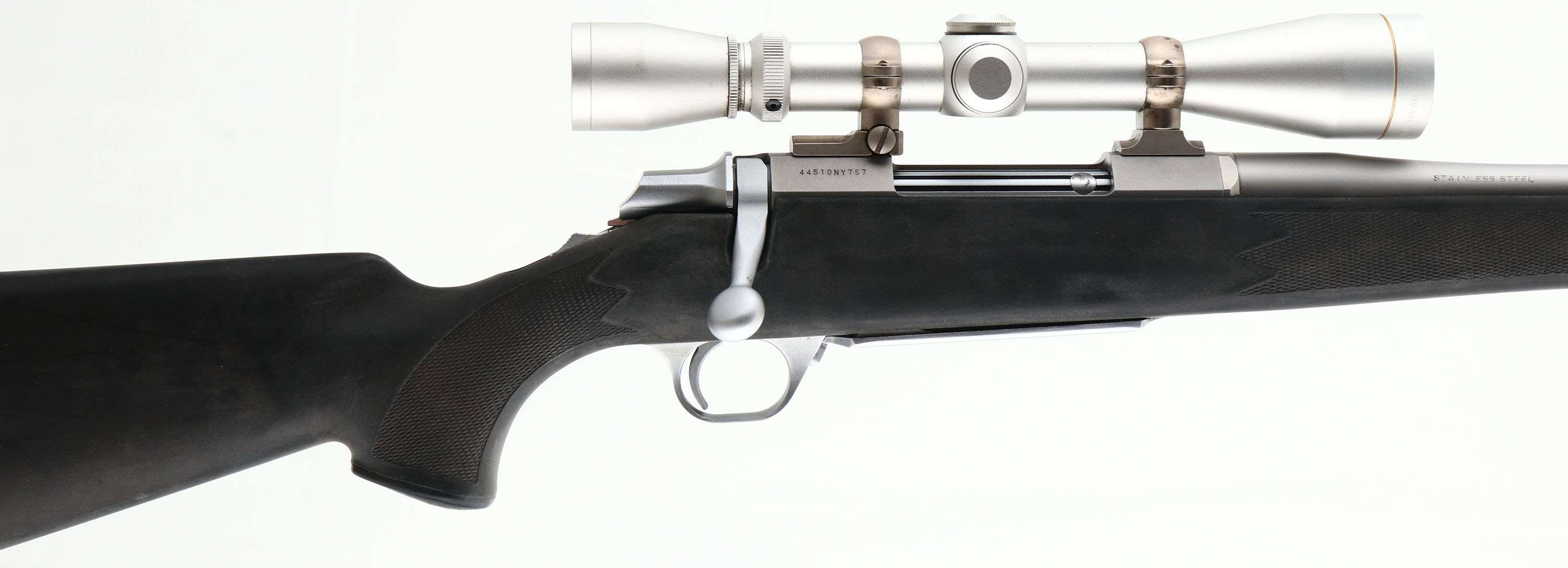 Browning, Model A-Bolt Stainless Stalker, Cal. marked 338 WIN MAG. Only, MFG. 1992, Japan, SN: 44510NY7S7, Bolt Action Rifle, 26'' Round barrel, The factory checkered & flat pistol grip matte black graphite fiberglass composite stock is excellent, but with very minor scuff or rubs & some use haze developing. The original matte stainless metal finish rates excellent overall. Receiver carries a matching Leupold Vari-x-IIc 3x9 scope, while barrel has no open sight provisions. Bore is excellent. Stock carries a Pachmayr ventilated recoil pad & sling studs. An excellent overall, all-weather hunting rifle. FFL Req. - Value: 500 to 850