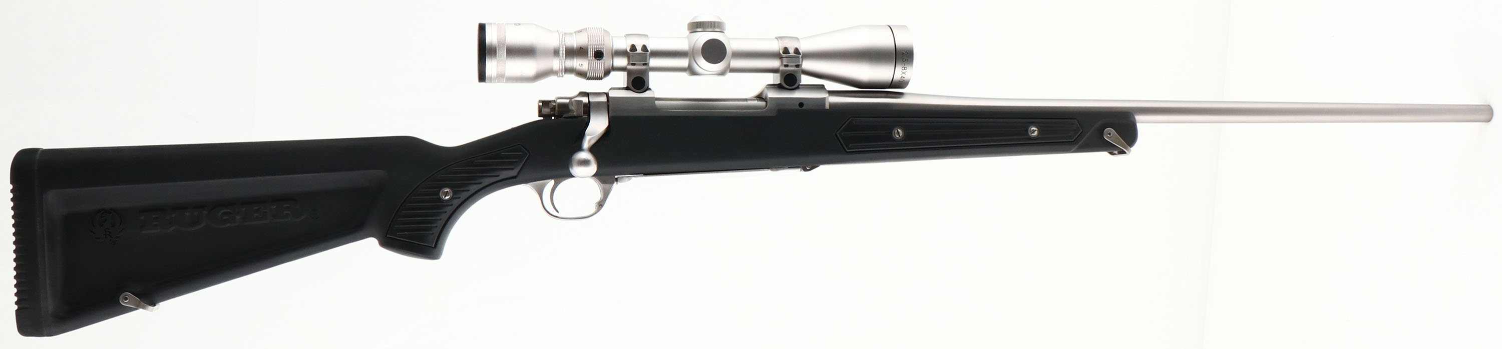 Ruger, Model M77 MARK II, Stainless All Weather, 30-06 SPRG Cal., MFG. 1994, SN: 782-57244, Bolt Action Rifle, 22'' round barrel, The factory Zytel synthetic stock (sometimes referred to as a skeleton or boat/canoe paddle stock) is excellent, with a few minor rubs. The stainless steel surfaces has a satin silver finish, which is excellent, with some very fine brush lines. Bore is excellent, Factory recoil pad & sling loops, Grooved receiver for scope mount. No sight provisions. Fitted with a satin silver matching Tasco 2.5-8X40 scope. A high quality, all weather, bolt action sporting rifle. FFL Req. - Value: 1000 to 2000