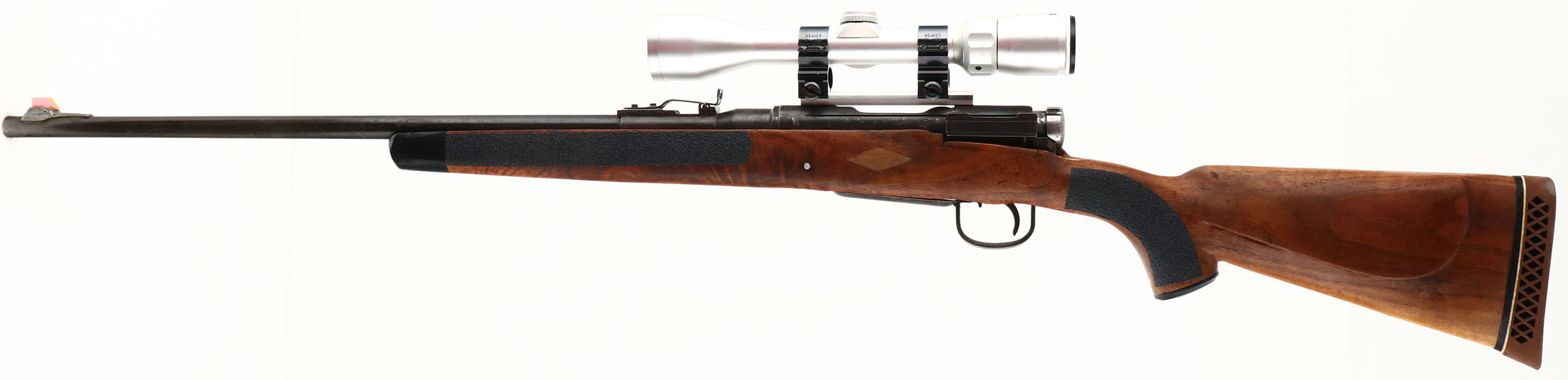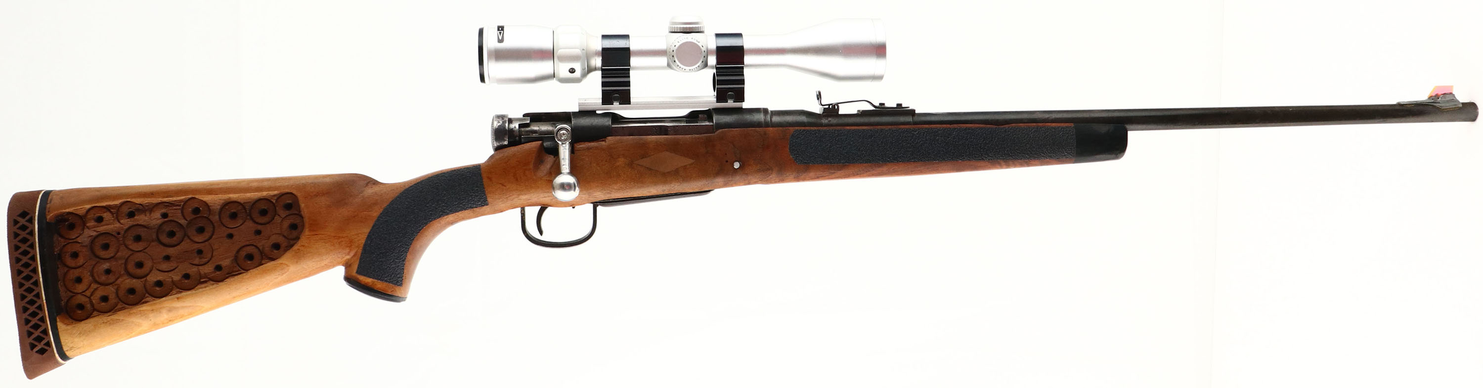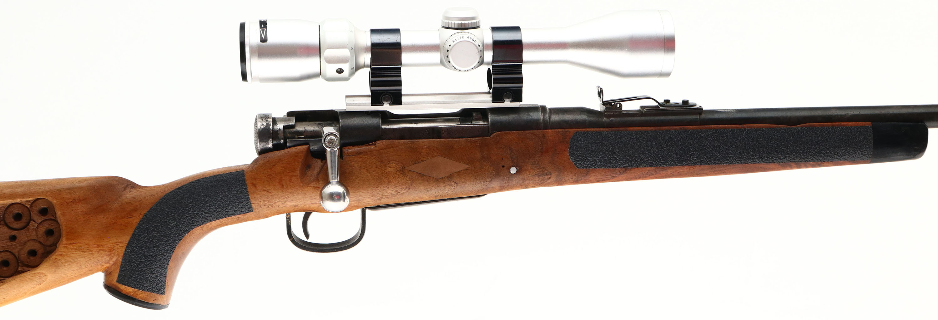 Sporterized Rifle, Built from a Nagoya Arsenal Type 99, CAL: 7.7x58mm Arisaka, MFG: 1939-45 (action), SN: 73707, Bolt Action Rifle, Cut down original round barrel to 23 1/2'' Round barrel. The repurposed cheeked & capped pistol grip wood stock is fair & solid, with a large amount of resin around the trigger plate, mag & behind the bolt at top of wrist to fill voids from original configuration of previous rifle. The right side of the stock has had much of the wood removed from drill press. Black textured step tape has been applied at the pistol grip & forend to add grip. Diamond inlays above mag on sides of stock filled with wood fill. Black forend tip. Despite the esthetics, stock is solid. There are some minor contusions, nicks & scratches. The metal surfaces were buffed, scrubbed to remove rust & carry a spotty gray/black finish over pitting. Fitted with a Bushnell Contrast Optics Elite 4200 scope on weaver mounts. The barrel carries a modified open rear sight on the original rear base & a plexiglass blade affixed to a ramp base, both sights use J.B.Weld to add stability. Bore is fair. Stock carries a Pachmayr ventilated recoil pad. Replaced & modified bolt handle. Appears to function correctly, but due to modifications, we recommend rifle visits a gunsmith before attempting to fire to confirm proper functionality, & is therefore being sold ''AS-IS'' with no returns. FFL or C&R Req. - Value: 100 to 200