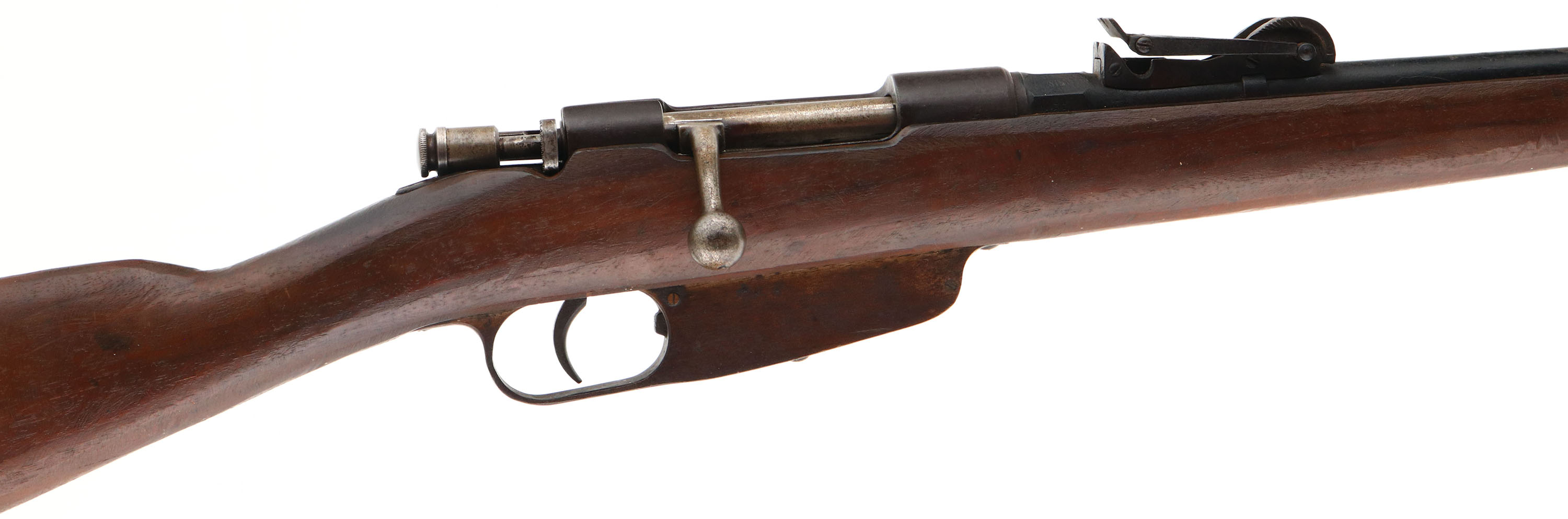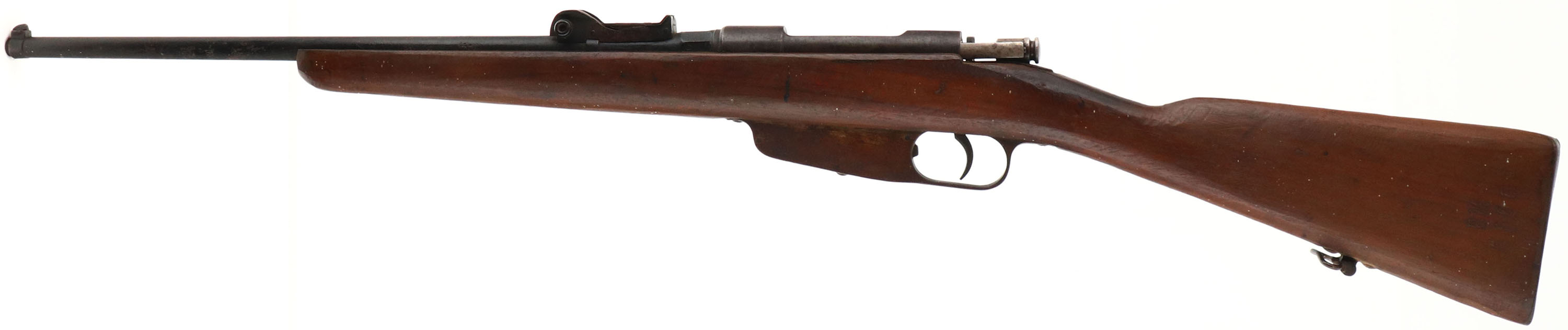 Sporterized Roma Italian 1891 Carcano, CAL: 6.5x52, MFG: 1918, SN: 605, Bolt Action Rifle, 21 3/4'' cutdown barrel. The original cut-down & roughly reshaped wood stock is fair & solid. The stock has a dark brown finish. The barrel appears to be the original, having been shortened. The barrel exterior was rough & pitted, & has a black sprayed finish on it which is peeling & flaking. The metal on the receiver, trigger guard & mag box is brown. The original rear sight has been altered but still has adjustment & there is a banded box blade front sight. Bore is fair. Stock carries a metal buttplate & rear sling loop. A roughly altered military conversion. FFL or C&R Req. - Value: 50 to 100