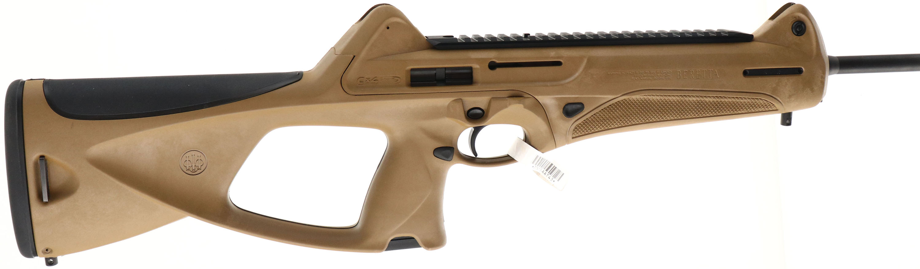 NEW, Beretta, Model CX4 Storm, CAL: 9mm, MFG: Modern, SN: CX77142, Semi Auto Rifle, 16 1/2'' barrel. The Beretta factory desert tan composite stock is excellent. The metal blue finish on the barrel rates 99%+ overall. Bore is excellent. The receiver holds a factory 10'' picatinny rail for optics. No open sight provisions. Stock carries sling studs & a solid black rubber recoil pad. HAS 17 RD magazine. NOS. No Box. FFL Req. - Value: 600 to 1000