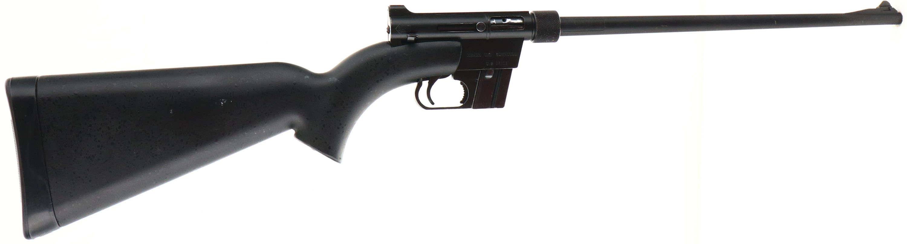 Henry Repeating Arms, Model U.S. Survival Rifle, CAL: 22 LR, MFG: Modern, SN: US28219, Semi Auto Rifle, 16'' barrel. The synthetic matte black stock is excellent, with a few use rubs or light scrapes. When broken down, the stock can contain the action, barrel, & (2) mags. This example only comes with one detachable mag. The matte black finish on the barrel rates 95%, 80% on receiver/ action, & with additional spotty wear to the mag. Bore is excellent. Factory sights. A perfect lightweight backpack / camping gun. FFL Req. - Value: 200 to 300