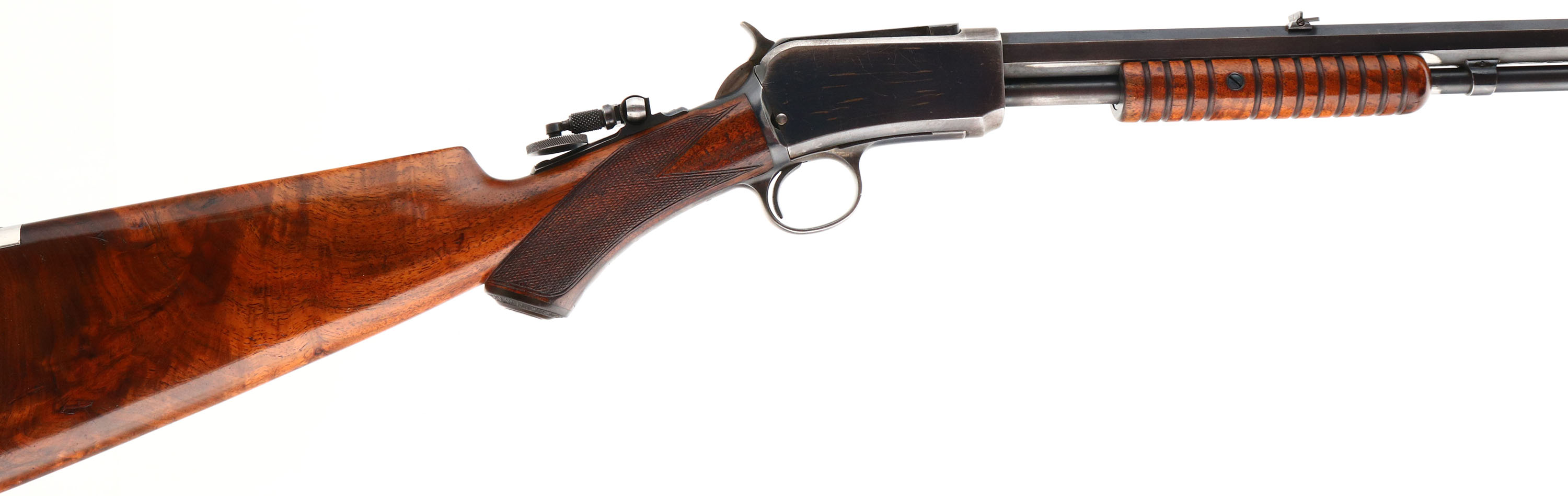 RARE DELUXE Winchester, Model 1890, NICKELED SWISS BUTTPLATE, 2nd variation, .22 WRF, Cal., MFG. 1905, SN: 234341, Pump Action Rifle, 24'' Tapered Octagon barrel. RARE LETTERED DELUXE, CAPPED PISTOL GRIP, WITH EXCEEDINGLY RARE NICKELED SWISS BUTTPLATE. According to the consignor, only 22 1890 rifles were produced with the rare Swiss buttplate. The deluxe, hand checkered & capped pistol grip wood stock is excellent. The stock displays excellent X quality rippled grain, which matches the single ''X'' stamping on the side of the lower left tang. The tang is also stamped with the assembly # 20649, which is also stamped on the end of the buttstock under the buttplate along with ''90'' for the model. The stock carries the original finish, with excellent checkering having the points rounded some from normal carry wear. There are small handling marks & light contusions. The forearm is a corncob style, which is correct as the letter refers to the rifle being ordered with only a checkered stock. The factory metal blue finish has 85% coverage on the barrel & mag, with some toning of the blue on the edges as it thins. The receiver retains about 75% of blue, with wear top & bottom & on lower tang. As indicated in the letter, the rifle is fitted with a Lyman large cup disc tang peep sight, folding leaf rear & a wind gauge sporting front globe sight, with ivory bead. Excellent bore. Comes with the factory letter. This is an extremely rare, & highly desirable special order rifle, with a rare configuration collectors desire. FFL or C&R Req. - Value: 12000 to 15000