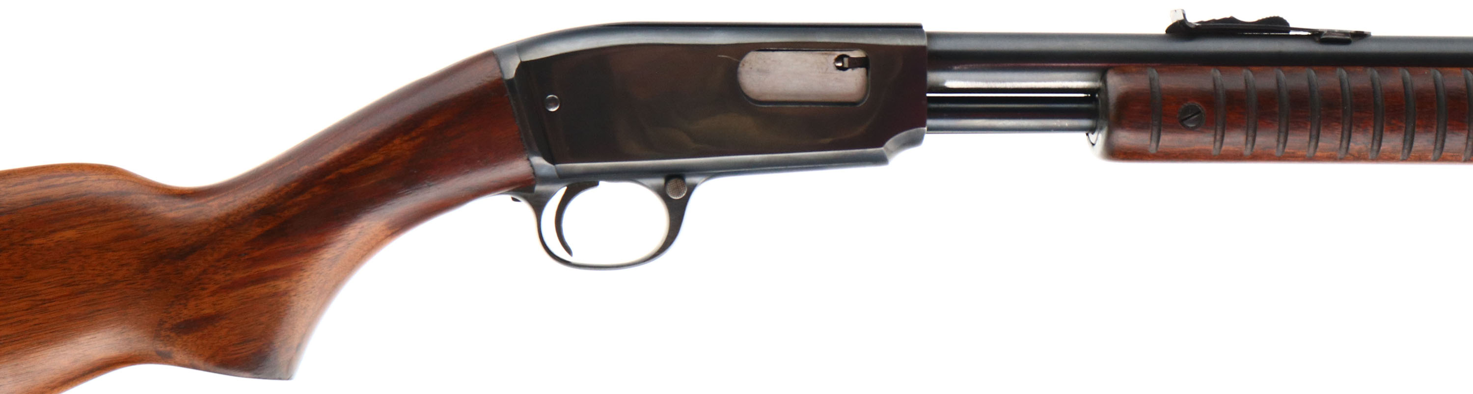 Winchester, Model 61, Marked .22 WIN. MAG. R.F., MFG. 1960, SN: 302347, Pump Action Rifle, 24'' round barrel, Desirable single caliber marking, with .22 Win Mag being the most desirable in the round barrels. The original flat pistol grip wood stocks are excellent, with the original finish & appears to possibly have a thin added layer on the stock. There are very few minor scrapes or handling marks to the finish. Metal is 98%, with visible wear contained mostly at the pump action. Original sights. Factory plastic buttplate. Bore is minty, bright & shiny. Very nice example & highly collectible in this caliber & condition. FFL or C&R Req - Value: 1000 to 2000