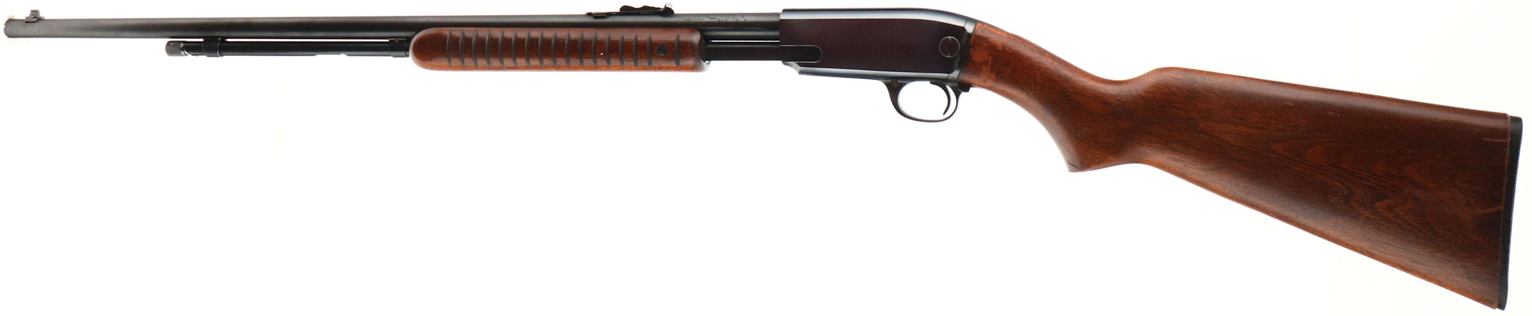 Winchester, Model 61, CAL: 22 S, L & LR, MFG: 1958, SN: 261988, Pump Action Rifle, 24'' barrel. Take-down Rifle. 24'' tapered round barrel. Grooved receiver for potential scope. The factory flat knob pistol grip wood stocks are excellent, retaining most of the original factory finish. There are a number of minor contusions, scrapes & edge nicks. The original metal blue finish rates 95%, with a very small area of rust speckling alone the upper right edge of the receiver. Bore is excellent. Standard open sights. Checkered factory plastic buttplate. Overall, very nice original condition example. FFL or C&R Req. - Value: 700 to 1400