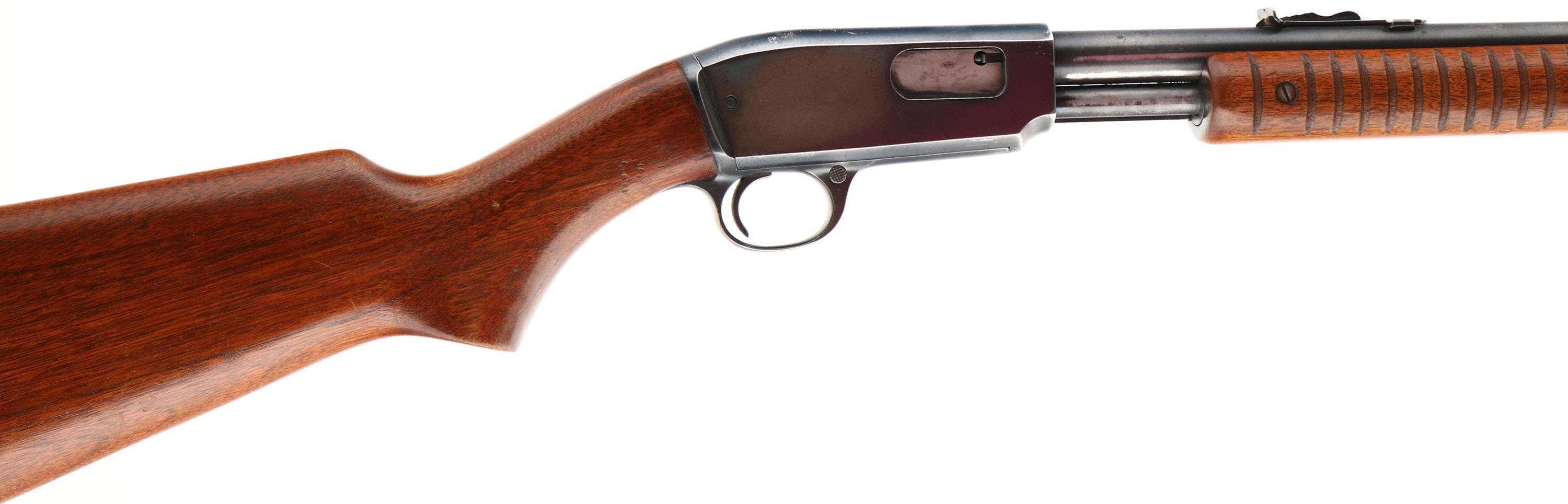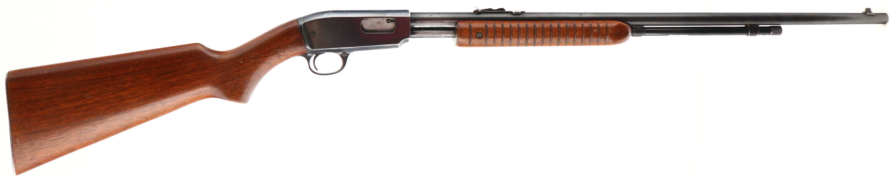 Winchester, Model 61, CAL: .22 S. L. or L.R., MFG: 1952, SN: 184919, Pump Action Rifle, 24'' Round barrel. Smooth top of receiver. The original flat pistol grip wood stock & grooved forend are excellent, with several minor scratches, nicks or contusions to the original finish. The original metal blue finish rates 85% overall. Bore is excellent. The barrel holds the original adjustable rear & small blade front sights. Buttstock carries the earlier checkered metal buttplate. Smooth action. A very nice & original example. FFL or C&R Req. - Value: 500 to 1000