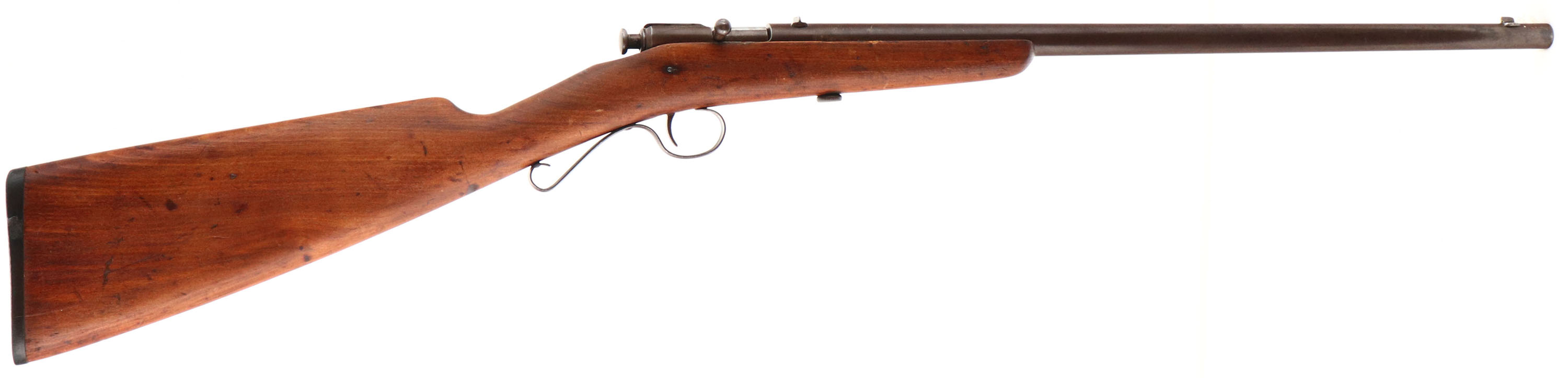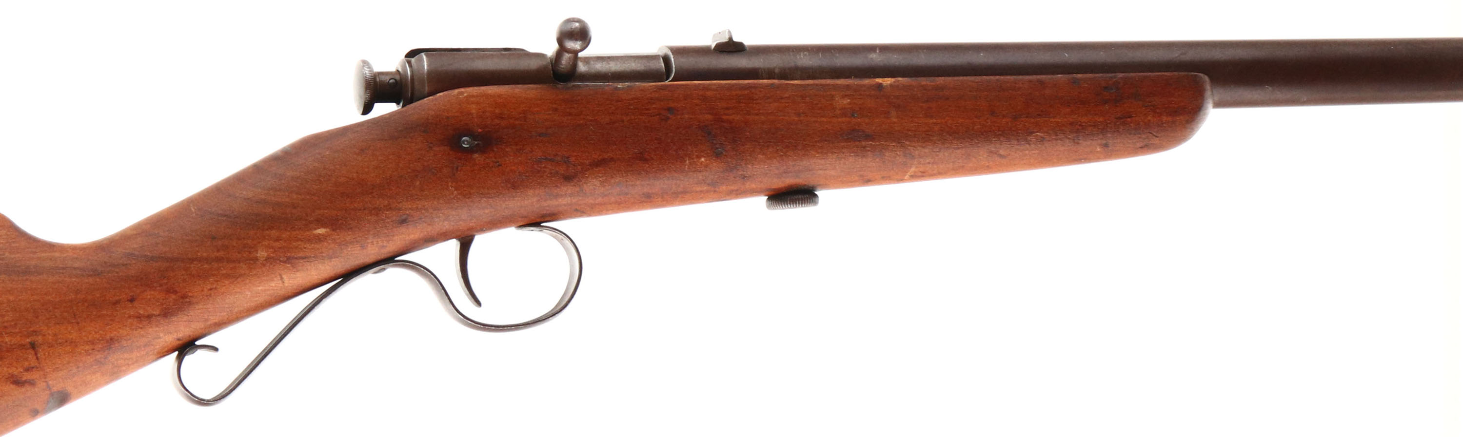 Winchester, Model 1902, CAL: 22 Short, Long & Ex Long, MFG: 1902-31, SN: NSN, Bolt Action Rifle, 18'' barrel. The original straight grip wood stock is very good & solid, but does have a 6'' stress crack repair on the left side of the stock that runs from the below the back end of the receiver up past the take-down screw. The stock was then lightly sanded & nicely refinished, with the remains of minor contusions, scrapes & scratches. The metal finish has worn to a chocolate brown patina. Bore is fair, with roughness & pitting amongst some visible rifling. The barrel holds a factory rear & small blade front sights. Stock carries the original worn hard rubber buttplate, with engraved screws. ''S'' shaped trigger guard. FFL or C&R Req. - Value: 100 to 300