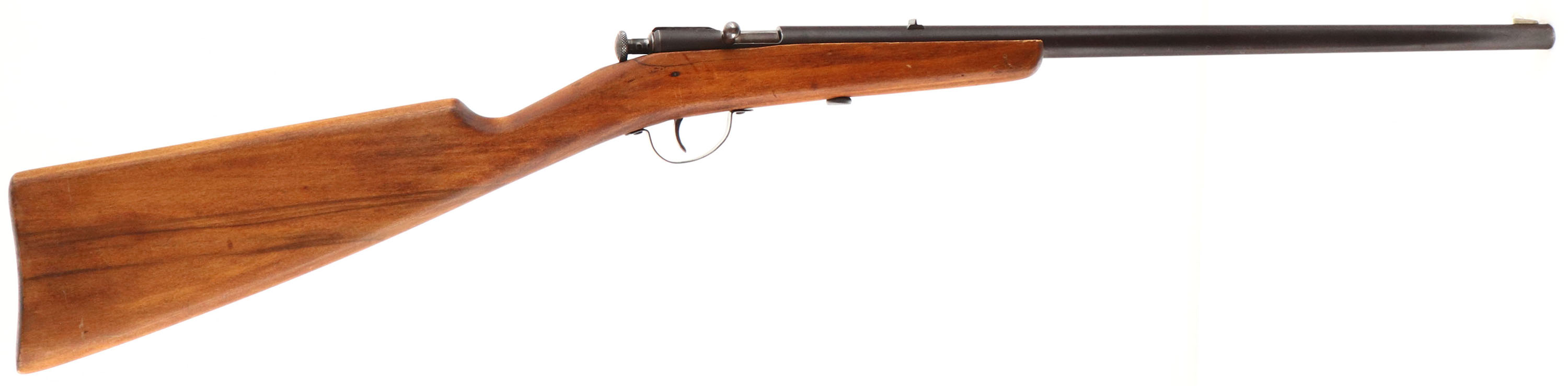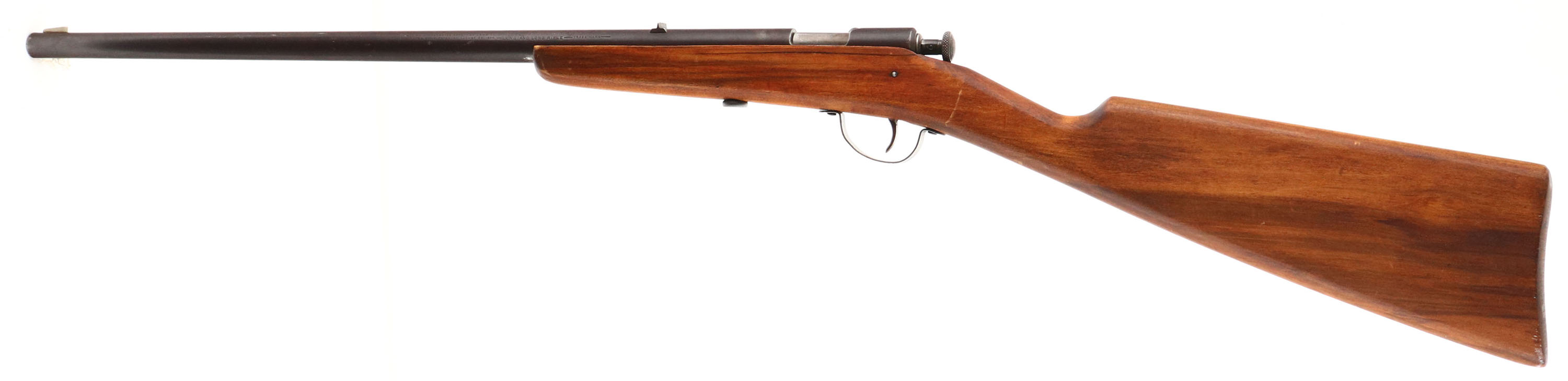 Winchester, Model 58, CAL: 22 S,L,LR, MFG: 1928-31, SN: NONE, Bolt Action Rifle, 18'' barrel. This is a fairly rare rifle as only 38,992 were produced during the four years of production. The straight grip wood stock is very good, having been sanded & refinished. There is a 4'' glue repaired stress crack on the right side upper edge under the receiver & a 5'' one on the left side. Nicely repaired before the refinish, with very few handling marks remaining. The metal blue finish has toned to a full coverage brown patina. Bore is excellent. Factory fixed sights. Produced without a buttplate. FFL or C&R Req. - Value: 150 to 300