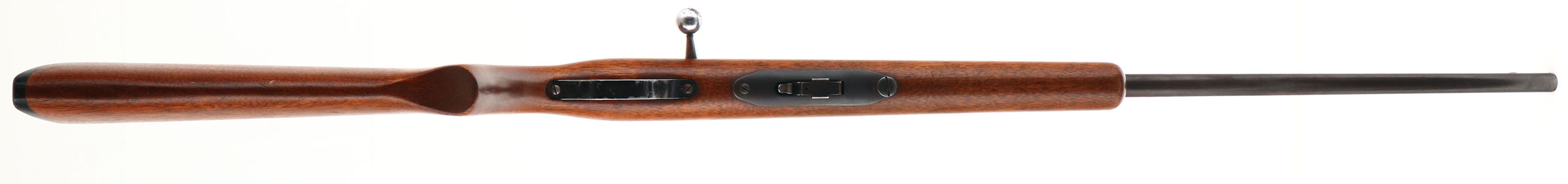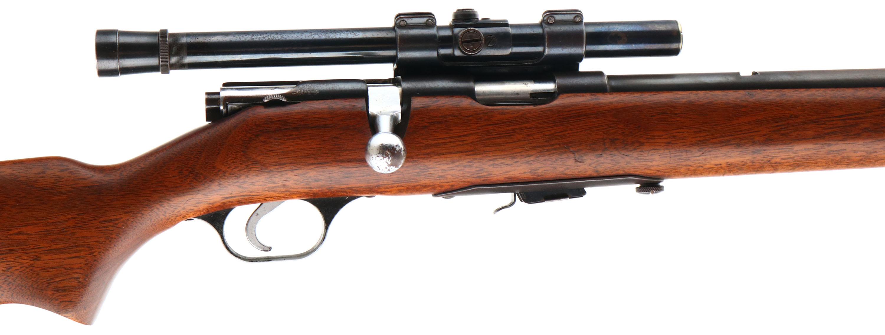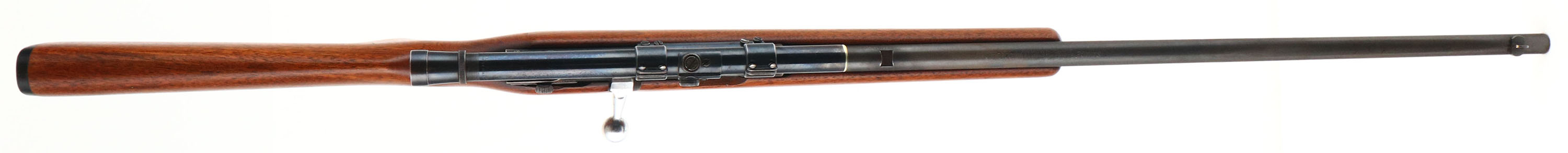 Savage, Model 4C, .22 S, L, LR Cal., MFG. 1933-65, SN: None, Bolt Action Single Shot Rifle, 24'' round barrel. The original flat pistol grip wood stock is excellent, with very few tiny handling scuffs or marks scratches to the excellent finish. The metal blue finish on the barrel rates 80%, 60% on the receiver, toning to a brown patina as it thins. Bore is excellent, Mounted with a Weaver B4 scope, while the barrel has an open rear dovetail & a blade front sight. Original black plastic buttplate. Detachable mag. FFL or C&R Req. - Value: 200 to 400
