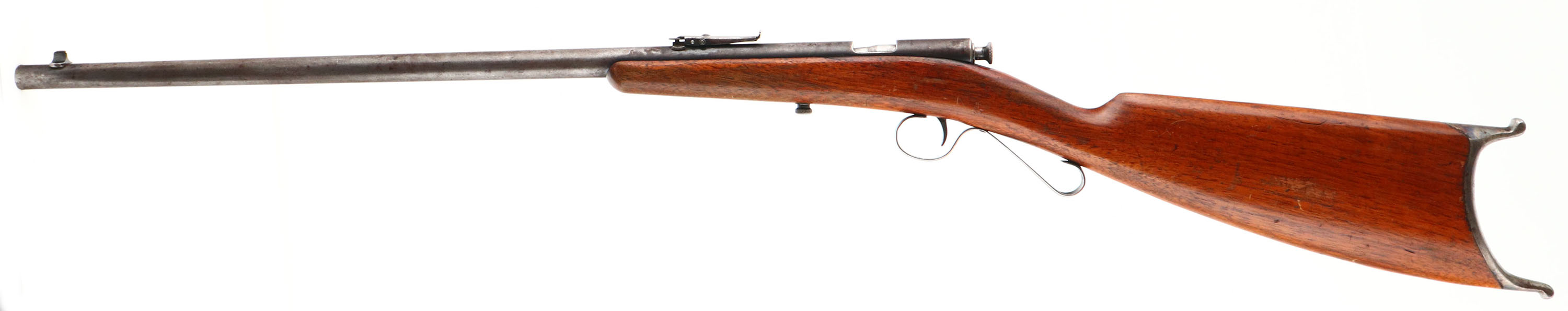 Savage, Model 1905, .22 S, L, LR Cal., MFG. 1905-24, SN: 26720, Bolt Action Single Shot Rifle, 22'' round barrel. The factory perch belly stock is very good & carries a fantastic Schuetzen style buttplate. The finish carries an added layer which has worn thin & is flaking in areas, with small scratches, scrapes & contusions. The factory metal blue finish has worn gray, with a spotty brown patina. Bore is fair, dark & rough, but with some visible rifling. Mounted with Savage marked adj. rear & front sights. A classic looking .22 rifle. FFL or C&R Req. - Value: 150 to 300