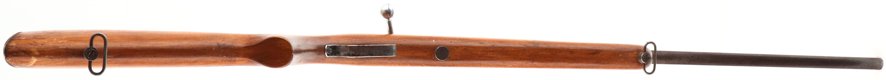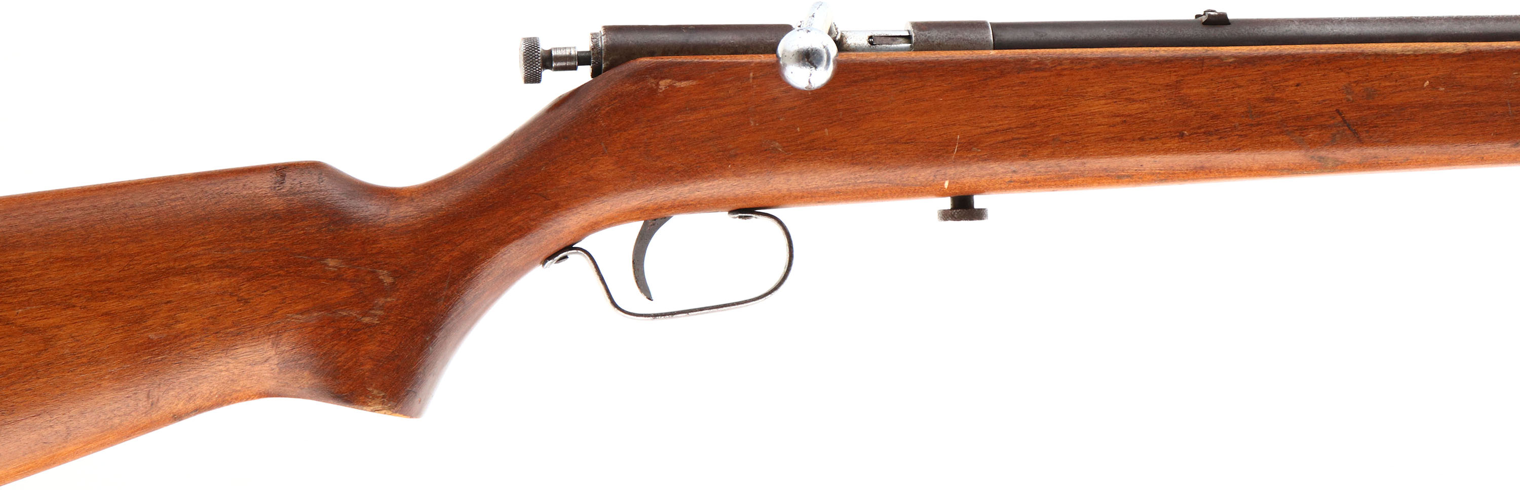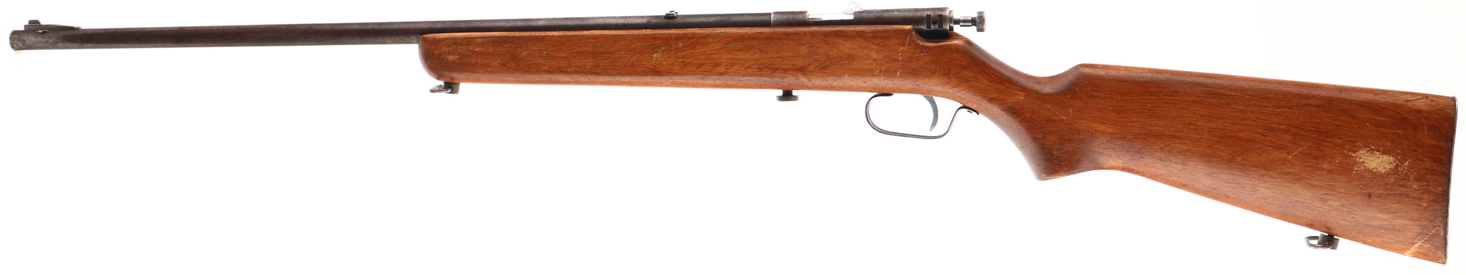 O.F. Mossberg & Sons Inc., Model 25, Cal: .22 S.L.LR, MFG: 1935-36, S/N: None, Bolt action rifle, 24'' barrel. The flat pistol grip wood stock is good, with scratches, scrapes, dings & wear to a previous sanding & refinish. There is a larger area of scrapes on the right side of the stock. The flat metal buttplate is slightly proud to the wood at the toe & the heel. The metal surfaces have mostly toned to a brown patina, with rust speckling. The bore is excellent. The barrel holds a blade front sight, with no rear sight. The stock carries a steel buttplate. Sling swivels. FFL or C&R Req. - Value: 50 to 150