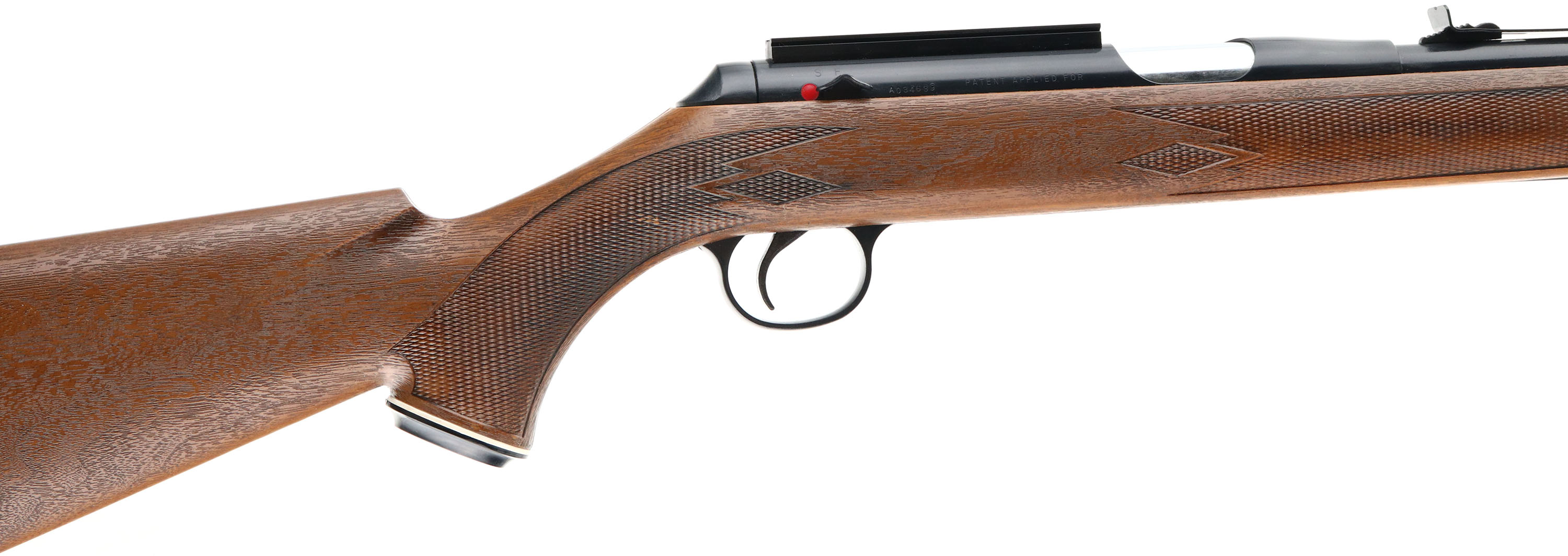 BOXED, Daisy & Heddon, VL Rifle, CAL: .22 Cal. Caseless VL Ammo, S/N: A034639, 18'' barrel. The original checkered & capped pistol grip wood grain plastic stock, with ebony toned forend tip, is excellent. The original metal blue finish rates 99%+ overall. Bore is excellent. The barrel holds an adjustable rear sight & ramp elevated blade front sight. Stock carries a VL grooved plastic buttplate. Comes in the original box, with internal packaging, a booklet & warranty card. FFL Req. - Value: 300 to 600