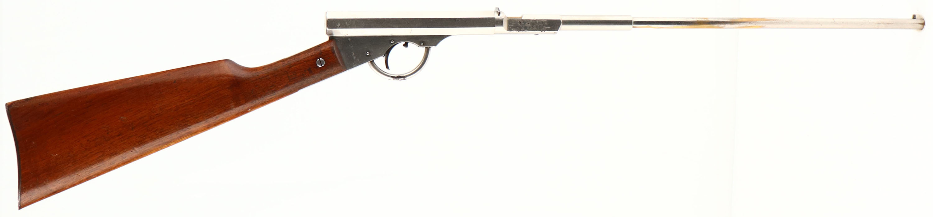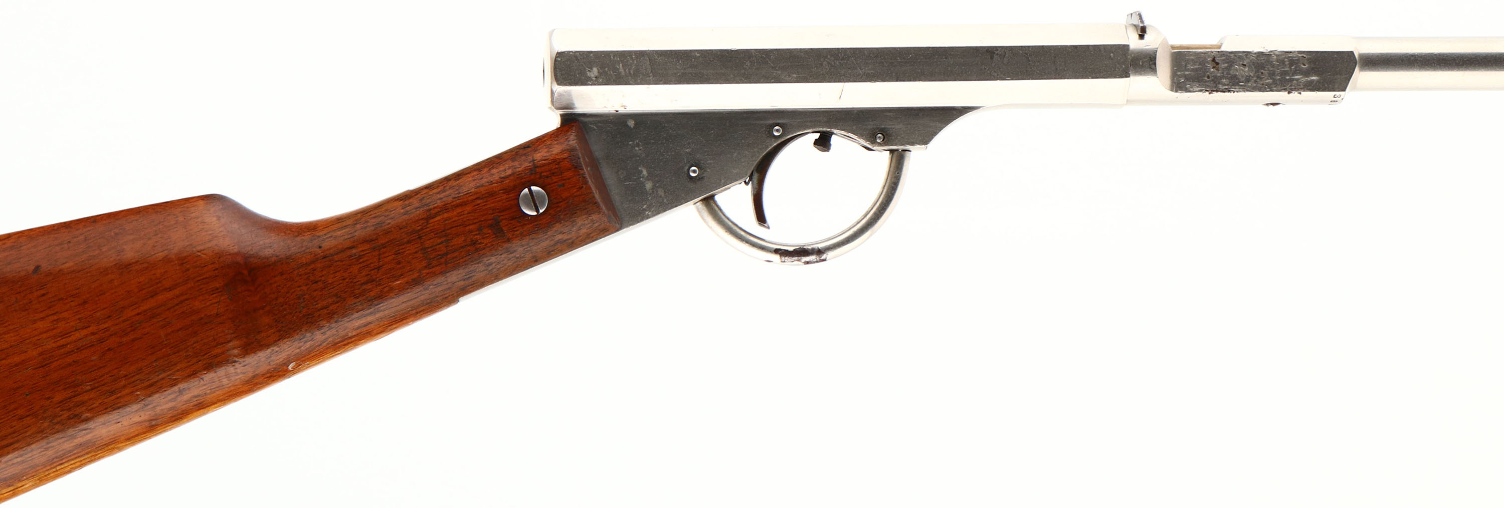 H.M Quackenbush, Model No. 1 Quackenbush Air Gun, CAL: .210'' diameter Darts & slugs, MFG: 1893-1920, SN: NONE, Single Shot Rifle, 16.5'' barrel. The No. 1 started production in 1893 to around 1920, & was the first in a line of variations & modifications, those being the models. 2, 3, 4, 7, 9 & 10. This earlier version is without the wood forearm. The original straight grip wood stock is excellent & solid. There are minor contusions, scrapes & dings, with a thin added layer of protective oil over the original finish. There is a glue repaired chip at the back of comb against the buttplate. The original nickel finish has 90% remaining on the receiver 60% on the barrel, with worn mostly due to pump action & some flaking on the trigger guard. Bore is good. Fixed rear sight & small post blade front sight. Original metal buttplate. The pumping of the barrel is very stiff & the action no longer generates compression for a shot. A good looking example that needs some gunsmith adjustment or repair. Rifle is therefore being sold ''AS IS'' with no returns. No FFL Req. - Value: 40 to 100