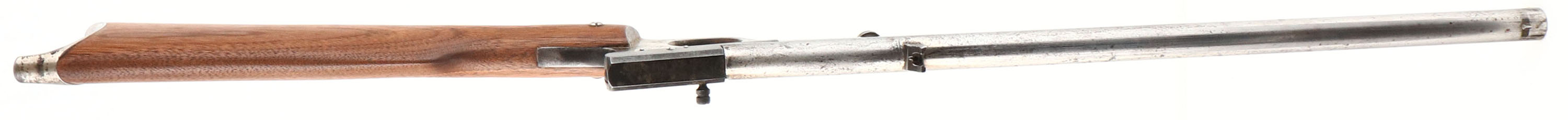 H.M Quackenbush, Safety Cartridge, CAL: 22 S,L,LR, MFG: 1890-1908, SN: NONE, Swing Gate Single Shot Rifle, 18'' barrel. The Safety Cartridge rifle started production in 1896 to around 1920, but a wood forearm was added in 1908. This is the earlier version without the wood forearm. The original straight grip wood stock is excellent & solid, having been sanded & nicely refinished. The metal surfaces have been buffed & polish due to rust pitting, but there remains a mix of original nickel, polished steel & spotty areas of cleaned black pitting. Bore is poor, dark & rough. Fixed rear sight (mounted backwards) & small blade front sight. Original early swiss style metal buttplate, with remnants of nickel finish. FFL or C&R Req. - Value: 100 to 200