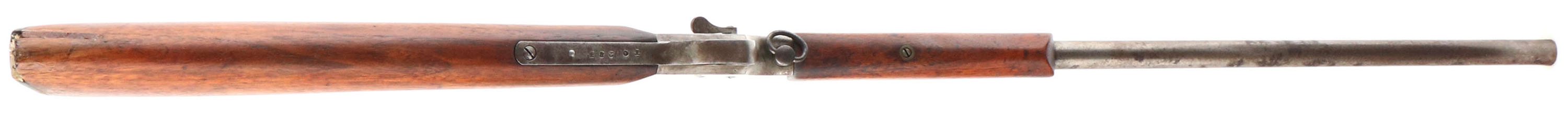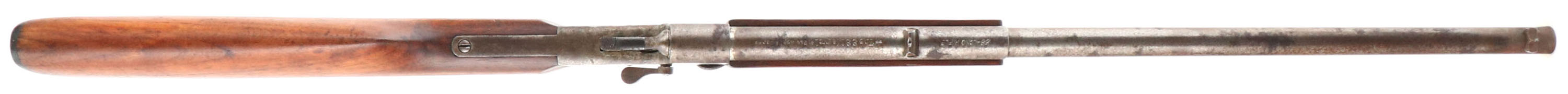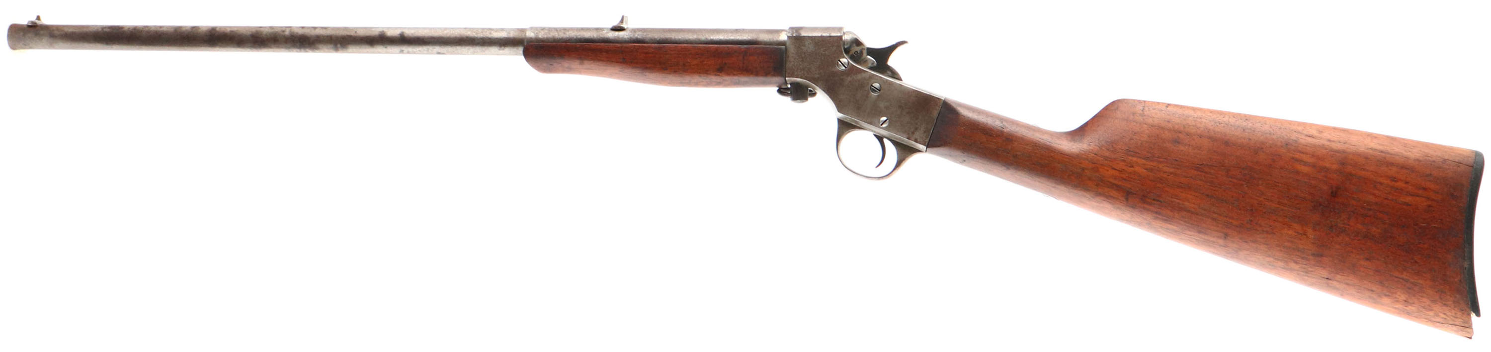 Marvel (Stevens), Model The .22 Marvel, CAL: 22 LR, MFG: N/A, SN: T283, Single Shot Rolling Block Rifle, 20'' barrel. The straight grip wood stock is good & solid, having been lightly sanded & refinished. There is a large edge chip fill repair at the toe & small cracks on the right/left side near the heel, along with some smoothed contusions & scrapes. The metal blue finish has entirely worn to metal gray, with spotted brown patina. Bore is fair, with scarring & pitting. Fixed notch rear sight & blade front sight. Checkered plastic buttplate, with large missing chip at the toe. FFL or C&R Req. - Value: 70 to 150