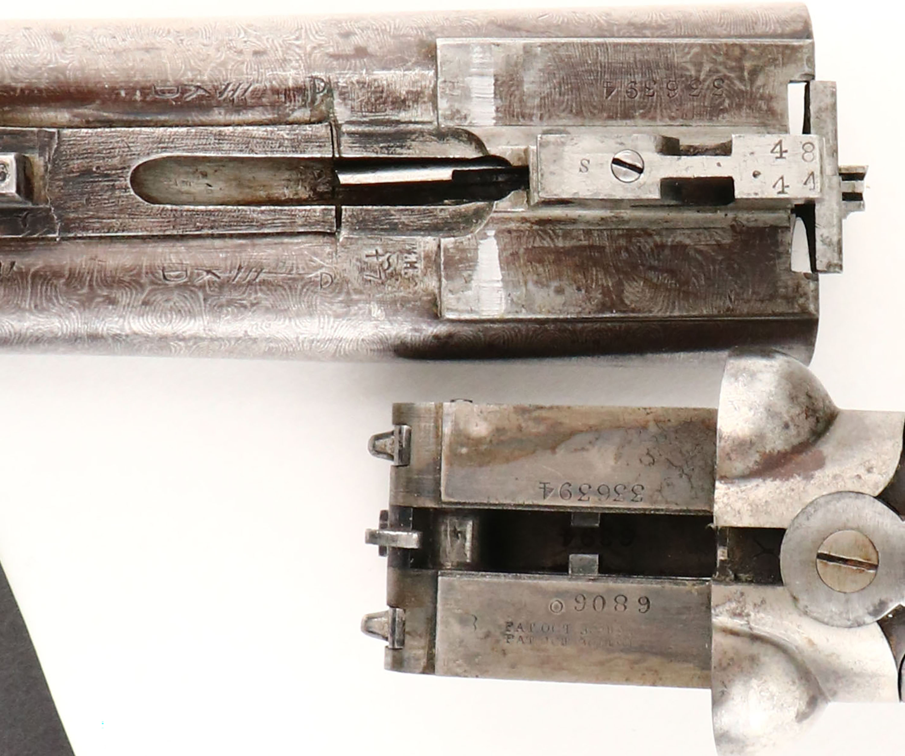 Remington, Model 1900, CAL: 12GA, MFG: 1900-1910, SN: 336394, Break Action SxS Shotgun. Choke: IM/IM, 30'' Damascus barrels. The checkered round knob wood stocks are good. There are multiple cracks in the forend, a large edge chip at the toe, one next to the receiver & multiple contusions, dings, & scrapes. The Damascus finish on the barrels is still prominent, worn to metal gray, with a thin brown patina & spotting toned to a brown patina. The case-hardened receiver has remnants of case-coloring in heavily protected areas, but mostly worn to metal gray, with spotting toned to a brown patina. Bores are good, with roughness & striations. The solid matted rib holds a single front bead. Stock has a RA checkered buttplate, with a toe chip. FFL or C&R Req. - Value: 200 to 400