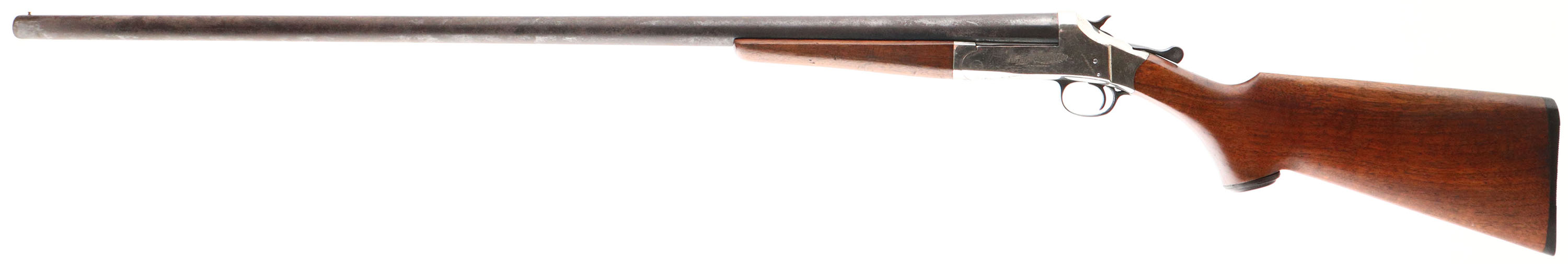 Belknap Hardware Co., Nitro Hunter, CAL: 12GA, MFG: 1890's-1930's, SN: A58472, Break Action Single Shot Shotgun, 36'' barrel. The capped pistol grip wood stocks are excellent. There are contusions & dings, mostly to the forend. The metal blue finish on the barrel has fully toned to a brown patina with consistent pitting throughout & the nickel finish on the receiver rates 60-70%, with consistent spotting throughout, toned to a brown patina. Bore is excellent. Brass bead front sight. Grooved plastic buttplate. FFL or C&R Req. - Value: 50 to 150