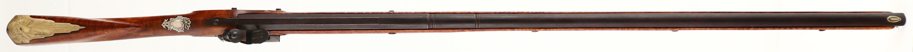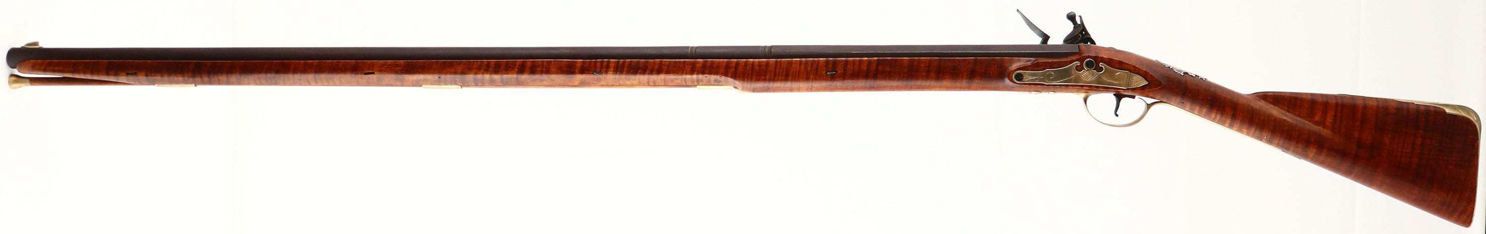 G.B. White, Buck & Ball Kit gun, Cal: .60, MFG: 1950's-80's, S/N: None, Flintlock Smoothbore muzzleloader, 42'' 1/4 octagon barrel. The straight wrist, striped pattern wood stock is excellent with little to no visible wear. Stock has a silver decorative emblem inlaid into the top of the wrist. The barrel is a browned finish with some thinned areas. The lock plate & other lock parts have been blued. The top of the barrel is marked ''G.B. WHITE''. All brass components are bright & shiny. The bore is excellent. Its bright & mirror like the barrel holds a bead front sight. The stock carries a brass buttplate with a extended tang over the comb that has hand engravings of a cannon & drum scene. Rifles comes with ramrod, a leather lock cover that marked ''The Leatherman'', & a piece of flint inside the hammer. A stunning example of a musket. Muzzleloader No FFL Req. - Value: 600 to 1000