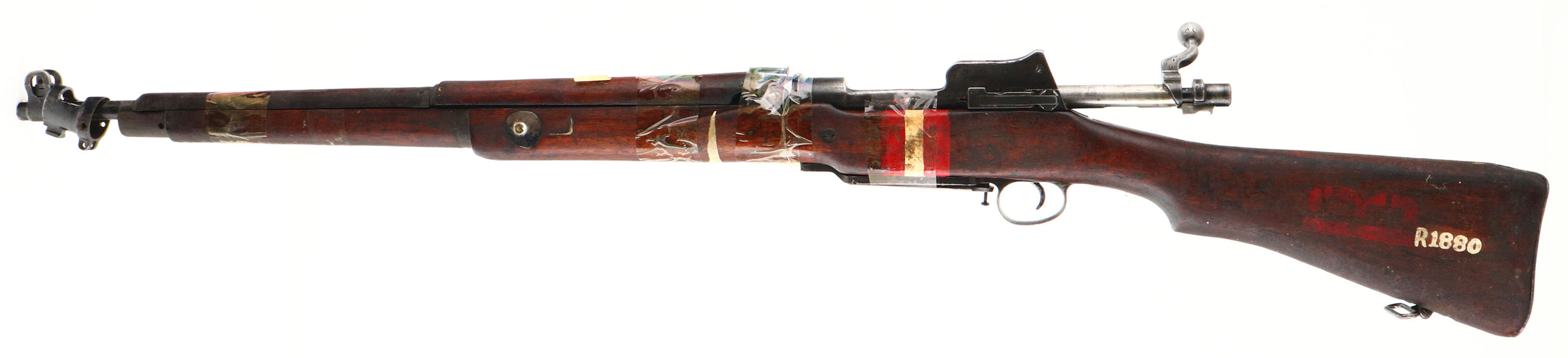 Eddystone, Model: P14 drill purpose rifle, Cal: .303 British, MFG: 1917, S/N: 494884, Bolt action rifle, 26'' barrel. The semi-pistol grip wood stock is very good with nicks, dings, scratches & wear from use/age. The stock has darkened from oils & age the mounting screws for the trigger guard & barrel bands is missing on this rifle. The stock has been painted around the magazine to indicate this a drill rifle only & not meant to be fired. Both cheeks of the stock have paint markings & faded cartouches. The metal finish rates 70% with areas of wear/thinning & areas starting to tone brown. The top of the receiver is marked with British proofs, a faint ''DP'' stamp, ''ERA'', & the S/N. the bore rating is irrelevant since a steel rod has been inserted to the chamber & welded in place ruining the barrel. The barrel holds a blade front sight with protective ears. The rear of the receiver has a elevation adjustable aperture rear sight. The stock carries a steel trapdoor buttplate. The rifle has both sling swivels but is missing the stacking swivel. These rifles were converted to drill use only for the British, they would paint the red & white strips on the guns & stamp them DP for drill purpose to signify that it was not meant to be fired. They had rods welded into chambers, firing pins clipped or sometimes nothing done to the rifle to stop it from chambering a round & firing. Even though on this rifle you can not physically chamber a round the receiver has not been touched so by ATF rules its still considered a firearm & is being sold with a FFL or C&R Req. - Value: 80 to 200