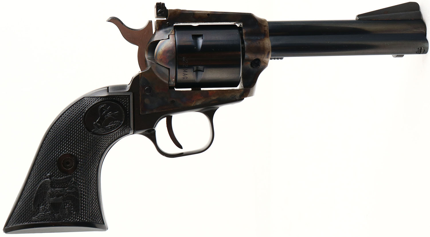 BOXED, Colt, New Frontier .22, CAL: .22 MAG, MFG: 1974, SN: G105461, Single Action Revolver, 4 3/8'' barrel. This variation features similar features to the Peacemaker 22, but has a flat-top frame, ramp front & adjustable rear sight. The top of the barrel is marked ''COLTS PT. F.A. MFG. Co. HARTFORD, CT. U.S.A.'', the left side is marked ''NEW FRONTIER .22'', the left side of the frame is marked with a two line patent date, ahead of the Rampant Colt logo. The Rampant Colt & E. Pluribus Unum checkered plastic grips are mint. The metal blue finish on the barrel, cylinder & trigger guard rates 99% & the case-hardened frame retains excellent & vivid case-colors. Bore is near mint. Factory adjustable square notch rear sight & serrated blade front sight. Comes in original SN matching wood grain box, with extra .22 MAG cylinder. A desirable & collectible Colt revolver. FFL or C&R Req. - Value: 600 to 1000