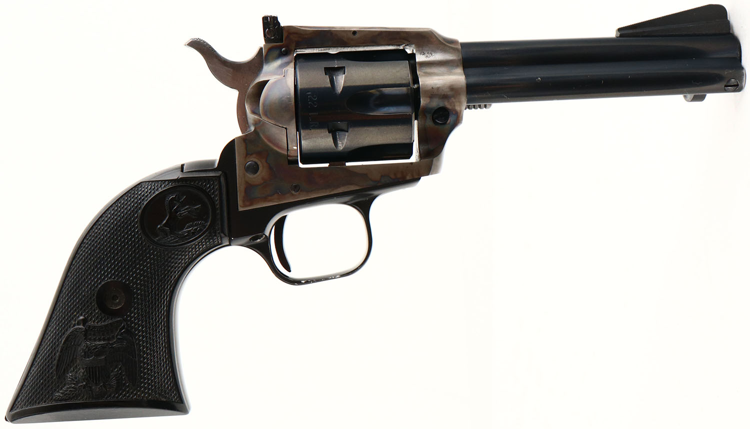 Colt, New Frontier .22, CAL: .22LR/.22MAG, MFG: 1974, SN: L22245, Single Action Revolver, 4 1/4'' barrel. The Rampant Colt & E.Pluribus Unum checkered plastic grips are excellent, with minor handling marks. The metal blue finish on the barrel rates 95%, cylinder rates 98% & the trigger guard rates 97%. The case-hardened frame retains excellent case-colors. Bore is excellent. Square notch rear sight & long serrated blade front sight. Comes with .22 MAG cylinder in red pouch & Bianchi leather holster. FFL or C&R Req. - Value: 400 to 600