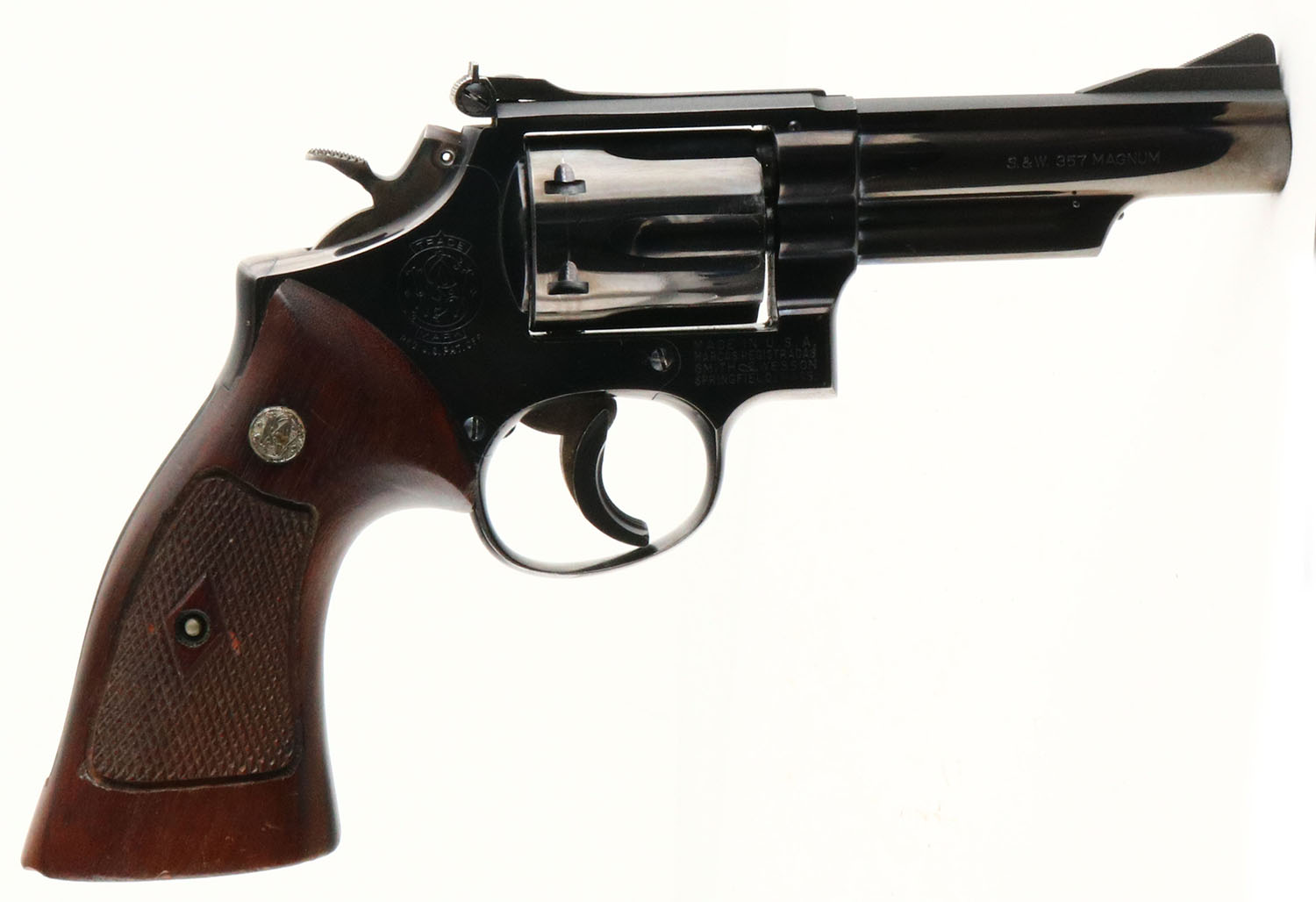 Smith & Wesson, Model 19-2, CAL: 357 MAG, MFG: 1965, SN: K650490, Double Action Revolver, 4'' barrel. The S&W logo medallion checkered wood grips are very good & solid. There are multiple small edge chips, along with scrapes & dings to the finish. The metal blue finish rates 97% overall. Case-hardened hammer & trigger retain excellent case-colors. Bore is excellent, with frosting & light spotting near the muzzle. Adjustable square notch rear sight & ramp elevated serrated blade front sight. Trigger shoe. Comes with Hunter brand leather holster. FFL or C&R Req. - Value: 600 to 900