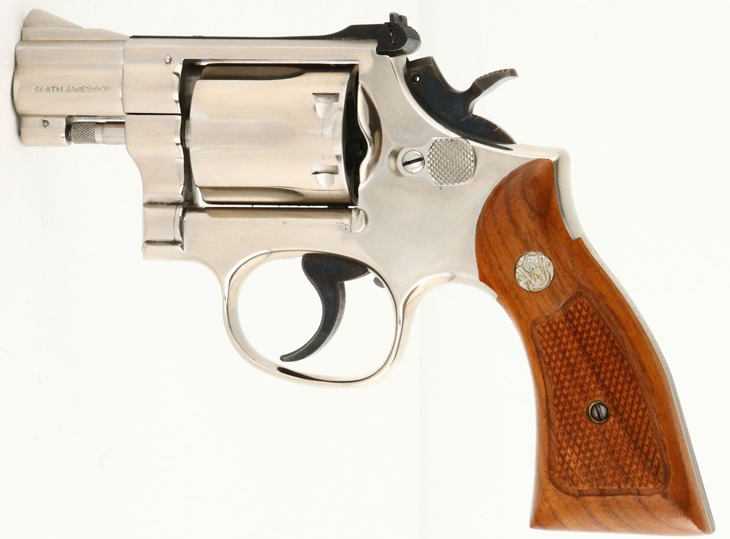 BOXED, Smith & Wesson, Model 15-3, CAL: 38 S&W SPL, MFG: 1977, SN: 14K3985, Double Action Revolver, 2'' barrel. The S&W logo checkered wood grips are mint. The original nickel finish is excellent overall, with visible thin brush lines, consistent with nickel finishes. The case-hardened trigger & hammer retain excellent case-colors. Bore is excellent. Adjustable rear sight & serrated blade front sight. Comes in factory SN matching box, with related paperwork, tool & cleaning rod/brushes. A nearly new example of a nickel 15-3. FFL Req. - Value: 600 to 800