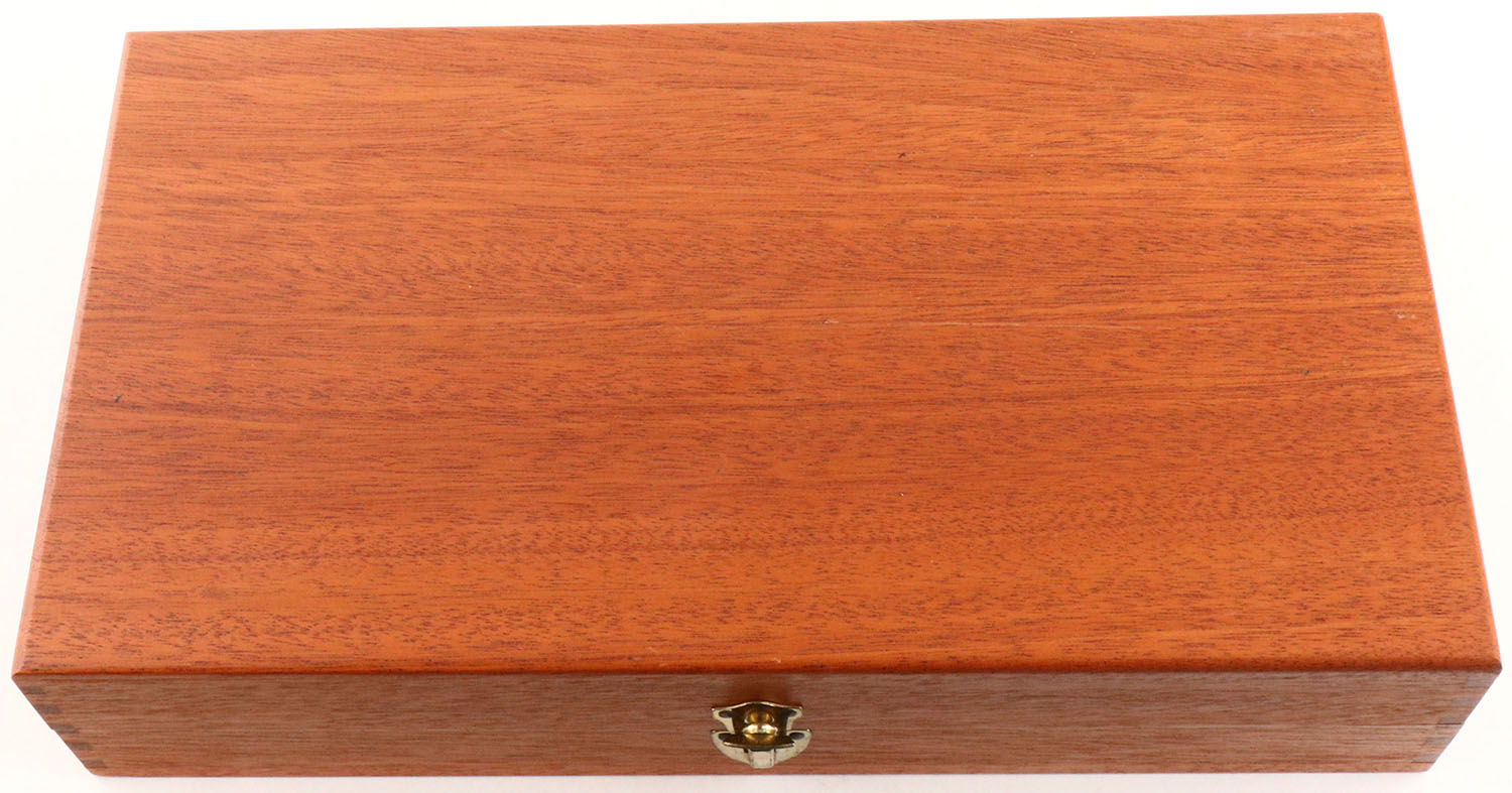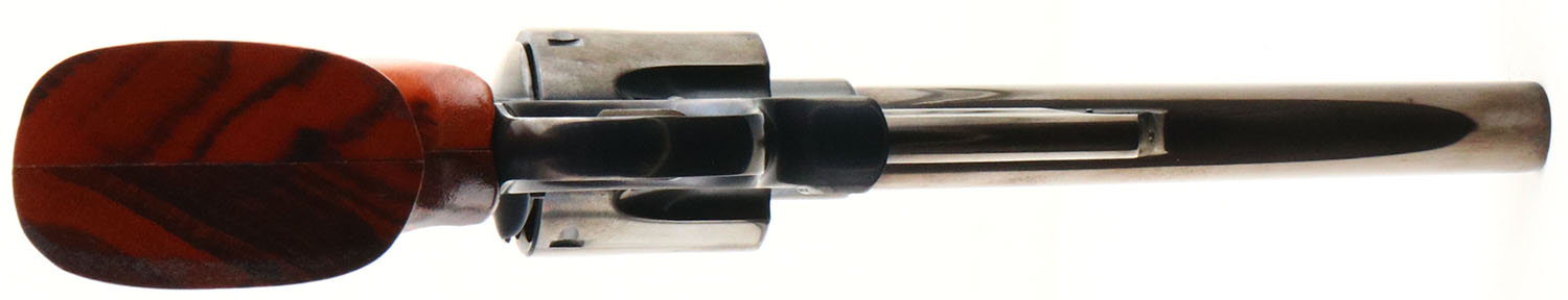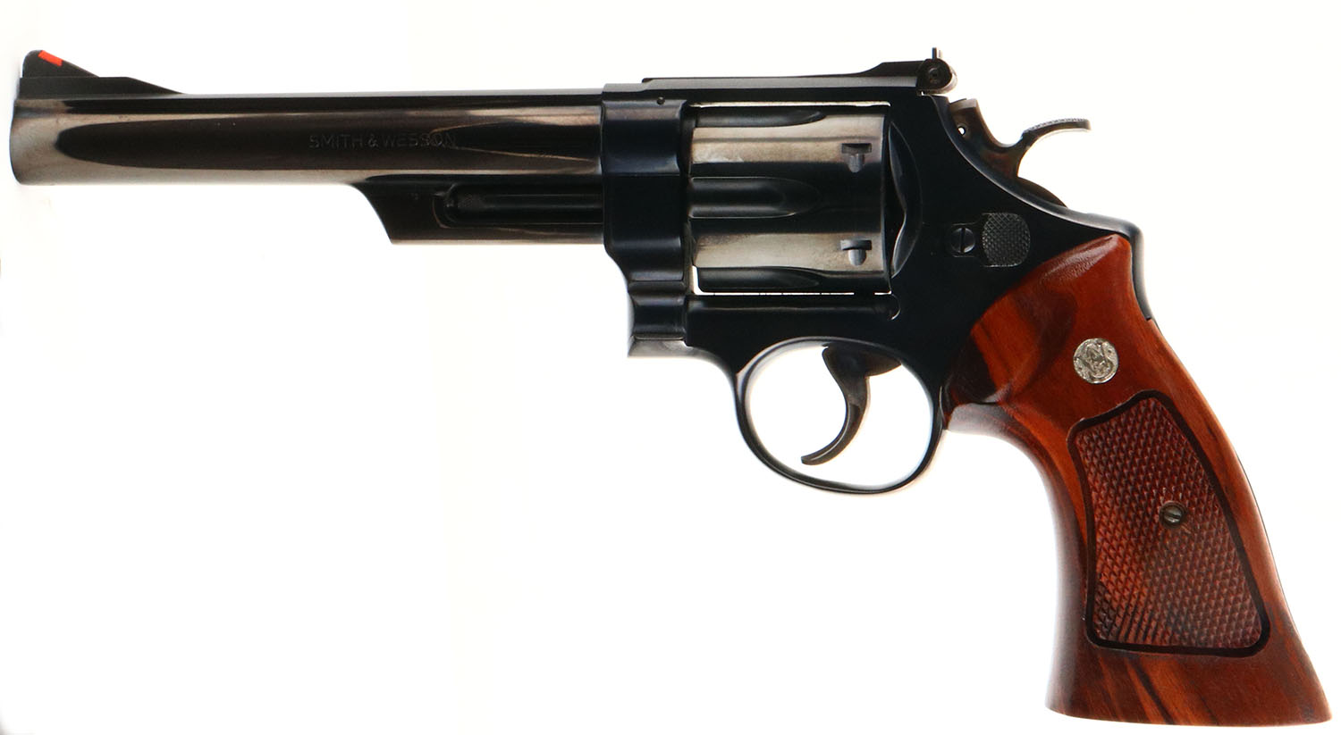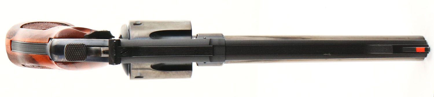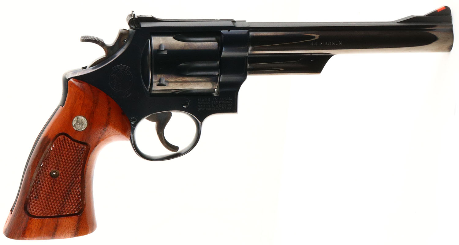CASED, Smith & Wesson, Model 29-2, CAL: 44 MAG, MFG: 1975-76, SN: N307705, Double Action Revolver, 6 1/2'' barrel. The S&W logo medallion checkered wood grips are mint. The metal blue finish rates 99%+ overall. The case-hardened trigger & hammer retain excellent case-colors. Bore is mint. Adjustable rear sight & serrated blade front sight, with orange insert. Comes in original wood presentation case, with outer cardboard sleeve & matching SN label. The inside of the case is deteriorating, from age and poor storage conditions. Exterior of case is excellent. Included in the case is a tool, cleaning rod/brush. FFL Req. - Value: 1000 to 1500
