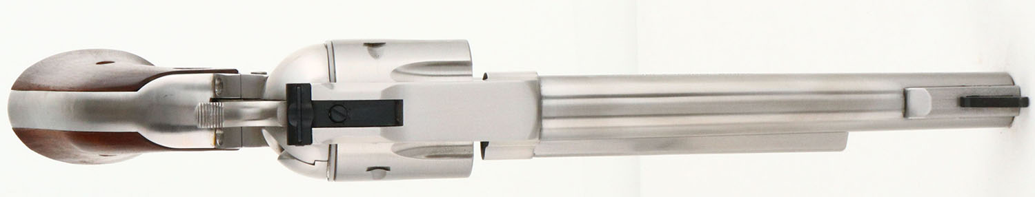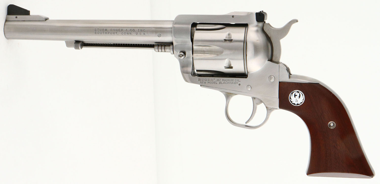 BOXED, Ruger, New Model Blackhawk, CAL: .357 MAG, MFG: 1974, SN: 32-58267, Single Action Revolver, 6 1/2'' barrel. The Ruger logo medallion wood grips are mint. The stainless steel finish is excellent. Bore is mint. Adjustable rear sight & elevated blade front sight. Comes in factory SN matching box & outer cardboard sleeve. The plastic cylinder disc is still present. Additionally, comes with original purchase receipt from 1974. NOS. NIB. FFL or C&R Req. - Value: 600 to 900