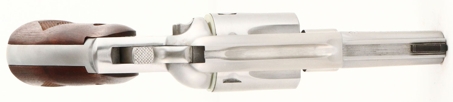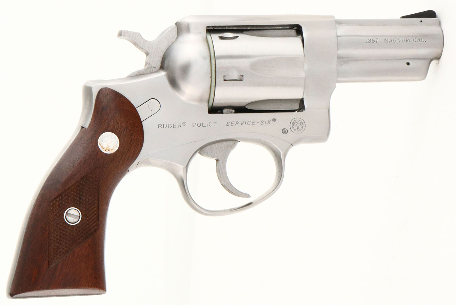 NEW BOXED, Ruger, Police Service-Six, CAL: 357 MAG, MFG: 1977, SN: 153-02109, Double Action Revolver, 2 3/4'' barrel. The Ruger logo medallion checkered wood grips are mint. The stainless steel finish is excellent. Bore is mint. Square notch rear sight & serrated blade front sight. The plastic cylinder disc is still present. Comes in factory SN matching box, with related paperwork & original packaging materials. NOS. NIB. FFL Req. - Value: 450 to 650