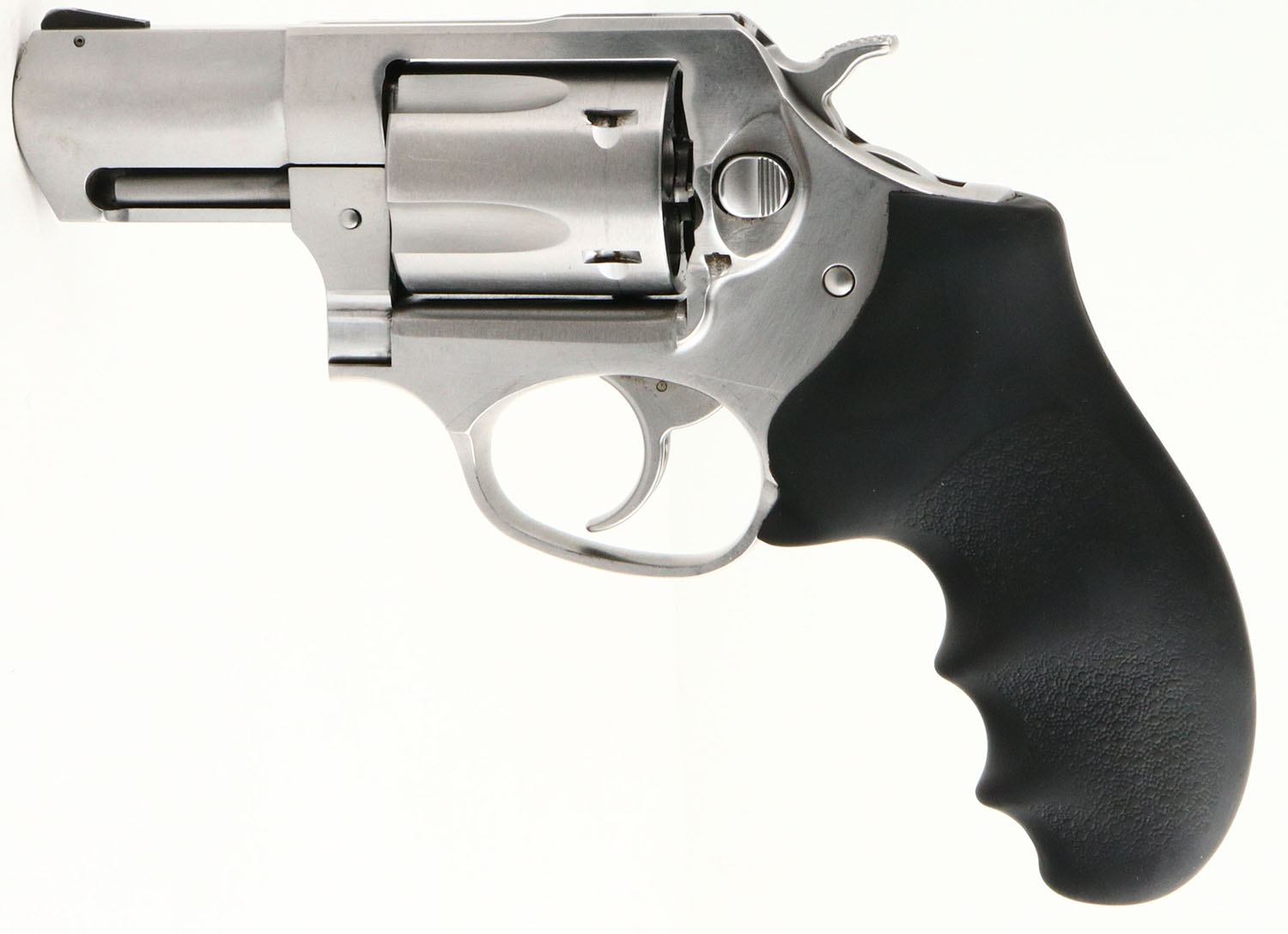 Ruger, SP101, CALL 357 MAG, MFG: 2014, SN: 575-59679, Double Action Revolver, 2 1/4'' barrel. The upgraded stippled Hogue rubber grips are very good, some stippling is worn smooth. The stainless steel finish is good, with consistent visible brush lines & scrapes throughout. Bore is excellent. Square notch rear sight & serrated blade front sight. FFL Req. - Value: 300 to 600