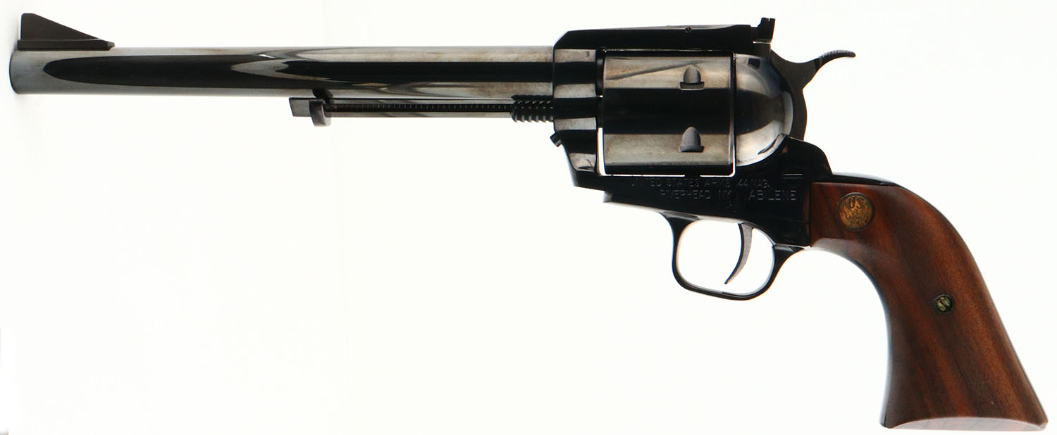 U.S Arms Co. Abilene (Model 508 AB), CAL: 44MAG, MFG: 1970's, SN: 50-003980, Single Action Revolver, 8 1/2'' barrel. The original wood grips with inlaid medallions are excellent. The medallions have a thin aged patina around the edges. The metal blue finish rates 99% overall. Bore is excellent, near mint. Adjustable rear sight & large serrated blade front sight. Comes in factory SN matching cardboard box. Box condition is very good, with some writing on the lid. FFL Req. - Value: 350 to 650
