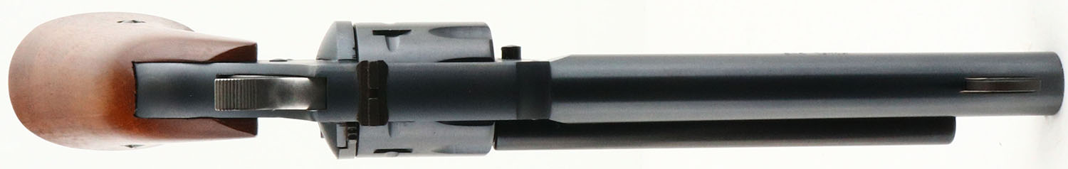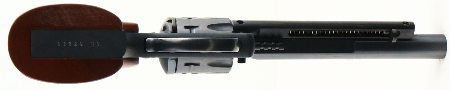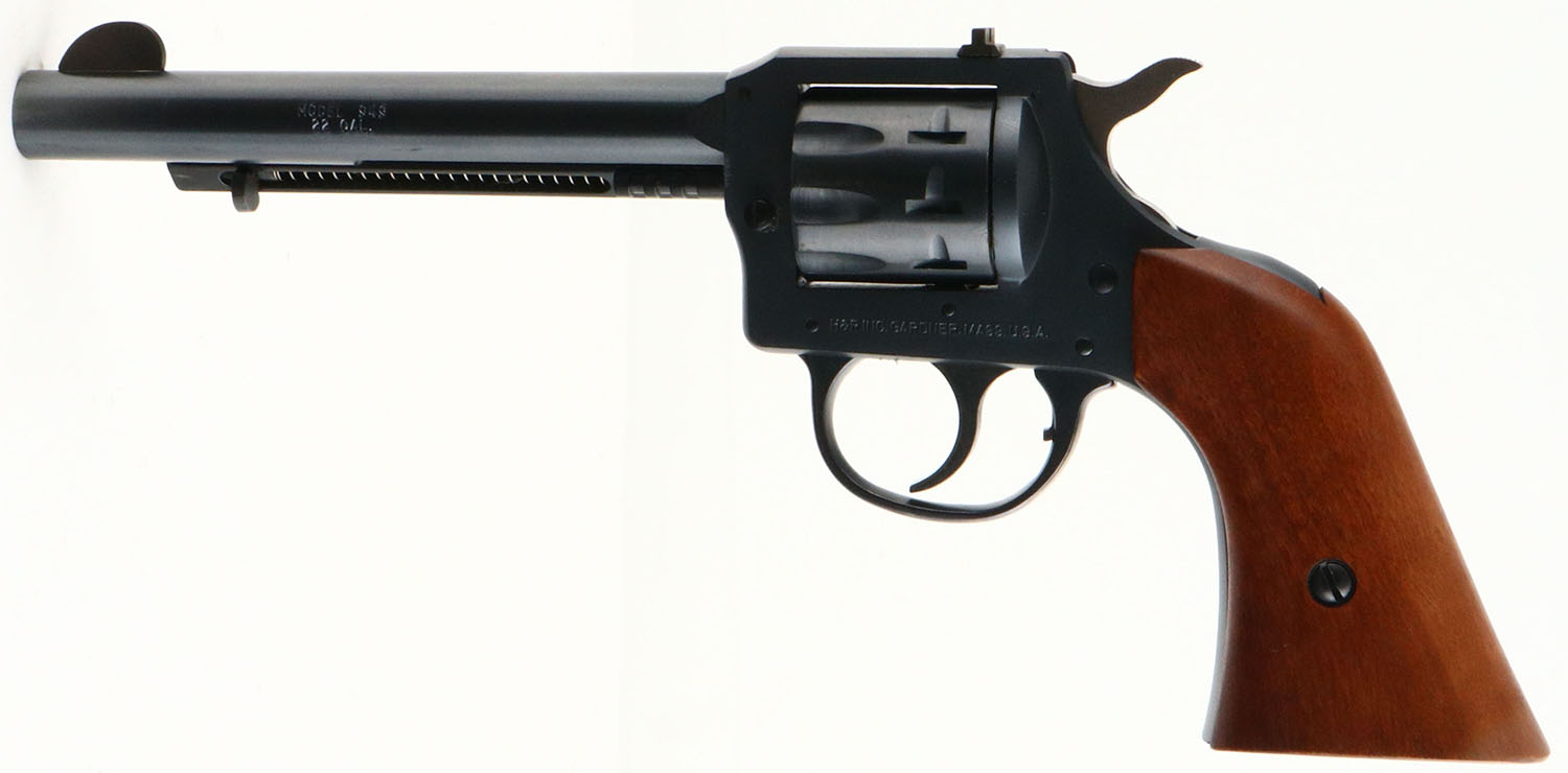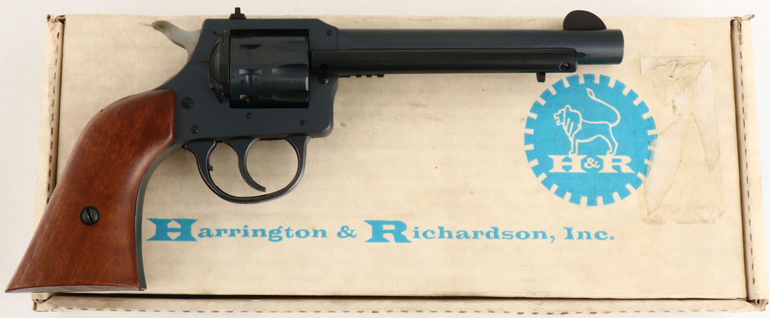 BOXED, Harrington & Richardson, Model 949 ''Forty Niner'' Second Model, CAL: 22, MFG: 1973-86, SN: AN65286, Double Action Revolver, 5 1/2'' barrel. The second model is identical to the first model, except the second model has a safety transfer bar. The wood grips are excellent. The metal blue finish rates 99% overall. Bore is excellent. Square notch rear sight & large blade front sight. Comes in factory SN matching box, with owners manual. FFL Req. - Value: 150 to 250