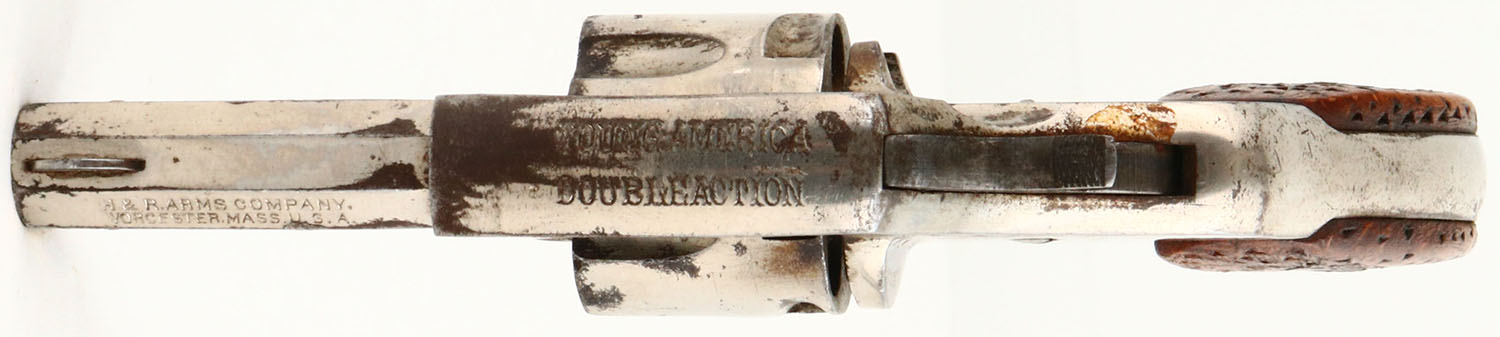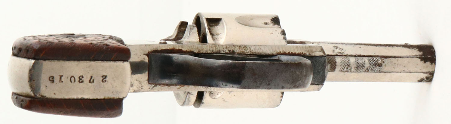 Harrington & Richardson, Young America D.A 1st Model - Third Variation, CAL: 32 S&W, MFG: 1905-41, SN: 273015, Double Action Revolver, 2'' barrel. The customized wood grips are excellent & solid. The grips have been notched with a triangle shape tool & have a hand etched diamond around the replacement screw. The nickel finish rates 80% overall, with areas worn to metal gray & toned to a brown patina. There is a small amount of rust around the hammer. Bore is good & bright, with roughness & intermittent pitting. Blade front sight. FFL or C&R Req. - Value: 50 to 200