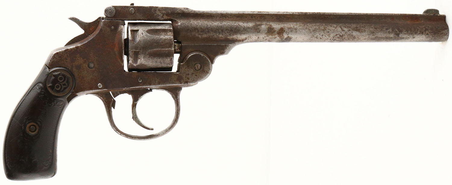 Iver Johnson, Model 1900?, CAL: 22, MFG: N/A, SN: 26802, Double Action Revolver, 6'' barrel. The IJ owl head grips are fair. There is a small edge chip on the upper front corner of the right grip, along with smooth checkering, contusions & scrapes. The metal finish has fully worn to gun metal gray & toned to a brown patina, with a fair amount of standing rust. Bore is fair, consistently rough with pitting. Notch rear sight & blade front sight. Multiple issues with mechanical operation. Needs to be inspected by a licensed gunsmith before operation. SOLD AS IS- NO RETURNS. FFL or C&R Req. - Value: 40 to 100