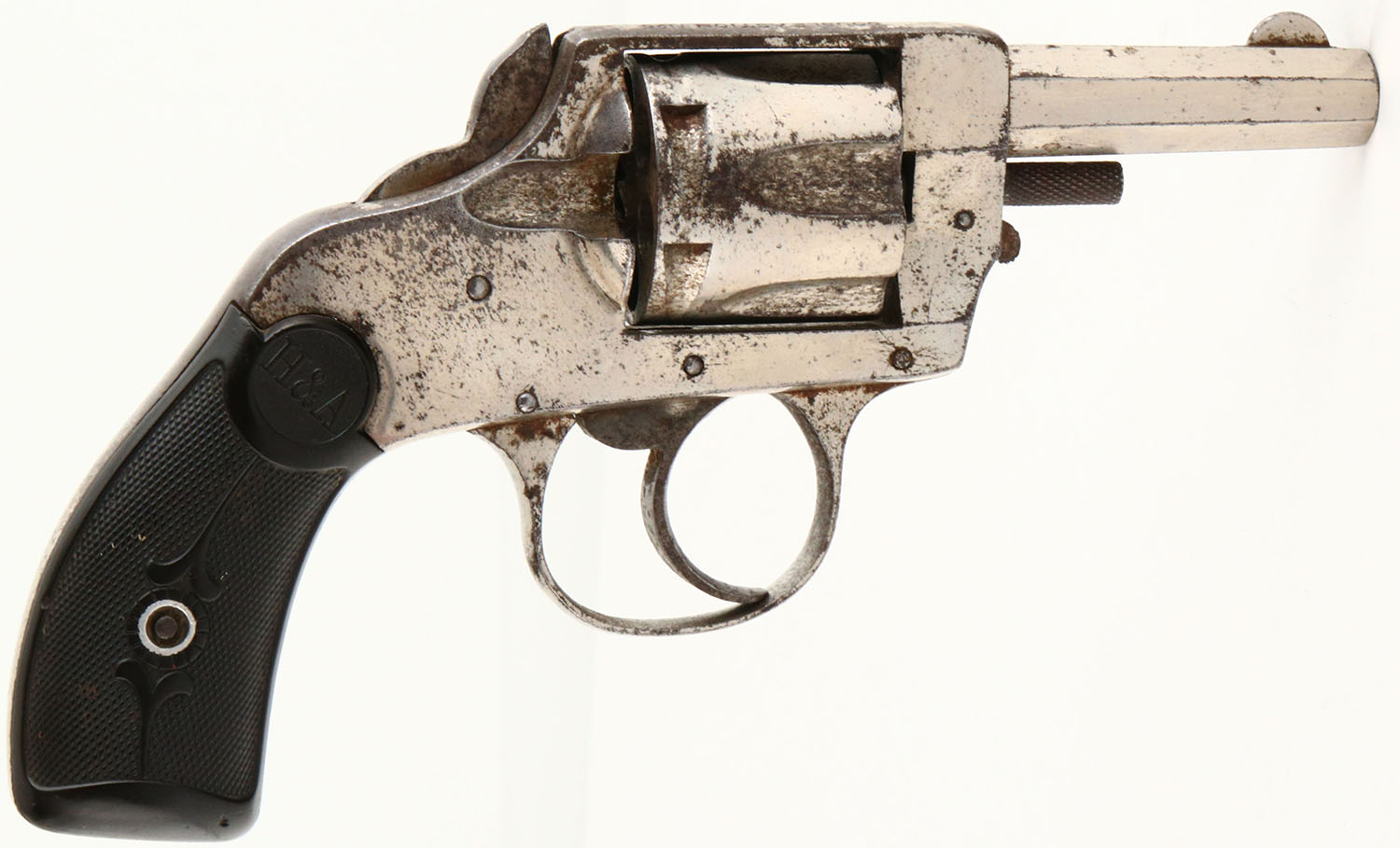 Hopkins & Allen, Double Action No.6, CAL: 32, MFG: circa 1890's, SN: 4174, Double Action Revolver, 2 1/2'' barrel. The H&A checkered hard rubber grips are excellent. There are minor contusions, nicks & dings. The nickel finish rates 80% overall, with consistent spotting toned to a brown patina. Bore is good & bright, with roughness & intermittent pitting. Notch rear sight & blade front sight. Hammer spur missing, ground smooth & tip of hammer checkered. Multiple issues with mechanical operation. Needs to be inspected by a licensed gunsmith before operation. SOLD AS IS- NO RETURNS. Antique, No FFL Req. - Value: 50 to 150