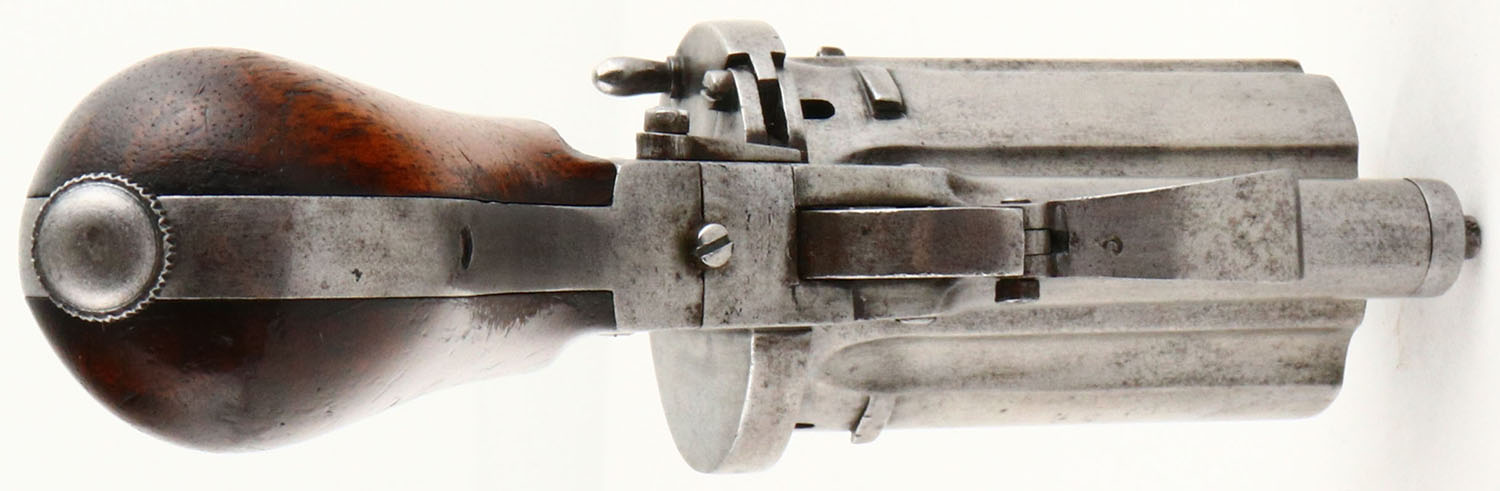 Belgian, Pinfire Pepperbox, CAL: 9mm Pin Fire, MFG: Antique, SN: 568, Double Action Revolver, 2 1/8'' barrel cluster. Liege markings on the rear cylinder face & ''Crown/V'' on the front cylinder face. The SN can be seen on the left side of the frame. The wood grips are very good, having been lightly sanded & refinished at one time. There is a ''VS'' scratched into the top of the left grip. There are smoothed contusions & scrapes, with darkening from the added finish. The metal surfaces have fully worn to a clean metal gray, with intermittent spotting & speckling toned to a brown patina. Smooth bores range from good to very good, depending on the amount of roughness in the individual bore. No sights. Lanyard stud. Mechanical operation appears to function properly. A neat folding trigger pinfire revolver. Antique, No FFL Req. - Value: 500 to 1000