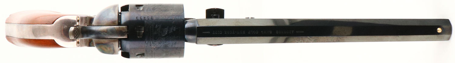 Colt, 1851 Navy - 2nd Gen, CAL: 36, MFG: 1976, SN: 21433, Percussion Single Action Revolver, 7 1/2'' barrel. The top of the barrel is marked ''ADDRESS SAM L COLT NEW-YORK CITY''. The cylinder displays a crisp Naval ship scene, with the engravers name visible. The left side of the frame is marked ''COLT'S PATENT''. All matching SN can be found on the frame, barrel, trigger guard & butt. The wood grips are excellent, with a small edge chip & a few dings to the finish. The metal blue finish on the barrel & cylinder rates 99%. The case-hardened frame & ram-rod retain excellent case-colors. The silver tone trigger guard is excellent, with the right side under the frame fading to a brass tone. Bore is excellent. Small brass cone front sight. Comes in a custom wood case, with powder flask & dual cavity bullet mould. The top back edge of the lid has some damage, otherwise excellent. Black powder, No FFL Req. - Value: 500 to 1000
