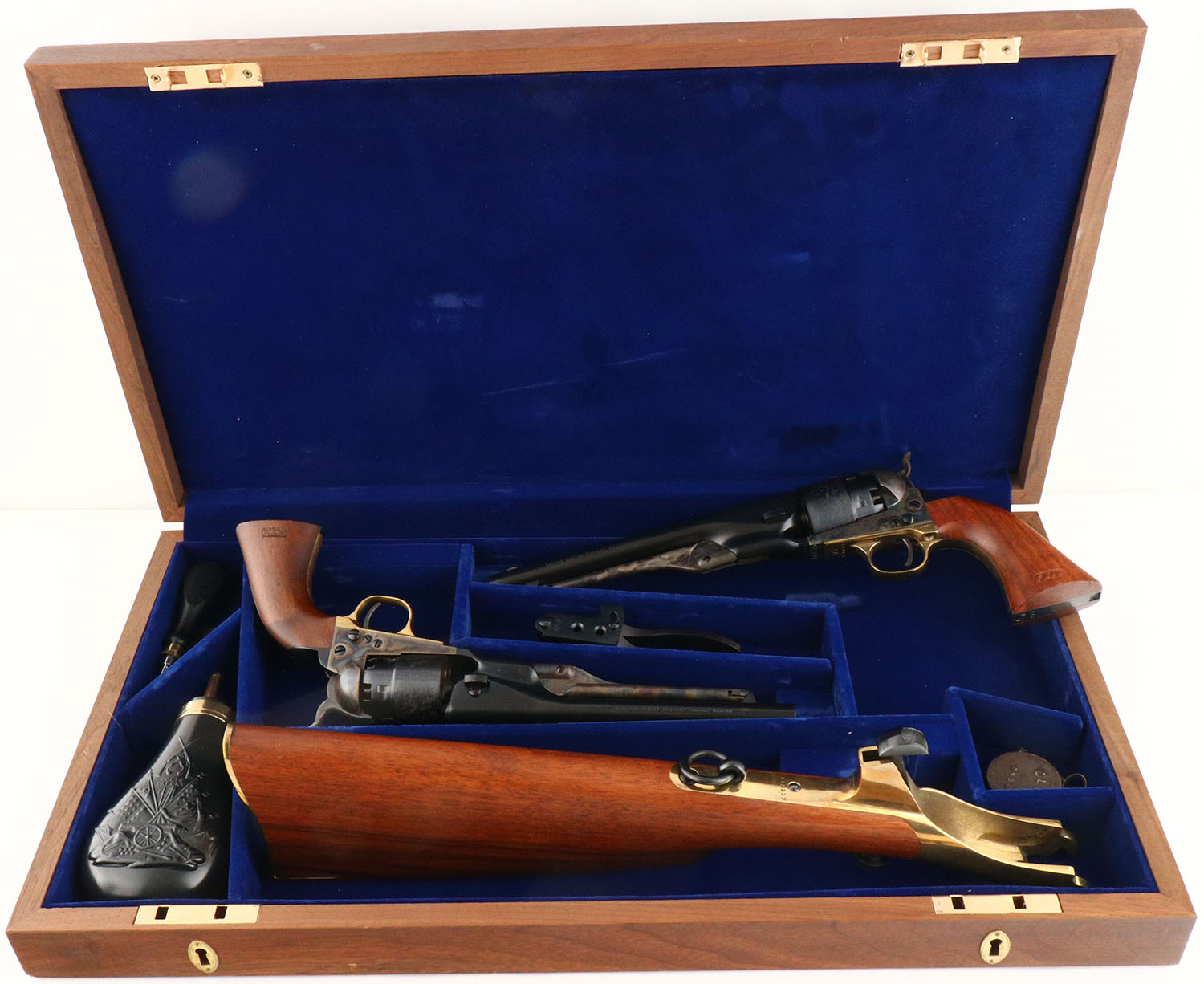 2) Colt, 1860 Army, CAL: 44, MFG: 1977, SN: 1117US, Single Action Percussion Revolver, 8'' barrel. The left side of the barrel is marked ''UNITED STATES CAVALRY COMMEMORATIVE''. The top of the barrel is marked ''ADDRESS SAM L COLT HARTFORD CT''. The left side of the frame is marked in three lines ''COLTS PATENT U.S''. The left side of the trigger guard is marked ''44 CAL''. The cylinder displays a crisp Naval engagement scene. Both grips have crisp ''MJH'' cartouches. All matching SN can be found on the frame, barrel, trigger guard & butt. The wood grips are excellent. The metal blue finish on the barrel & cylinder rates 99%. The case-hardened frame, hammer & ram-rod all retain excellent case-colors. Brass trigger guard is excellent, with a thin aged patina. Bore is excellent. Small brass blade front sight. Both pistols come in the factory presentation case, with attachable stock, powder flask, bullet mould, tool, cap tin & key. This set was presented to U.S Senator Barry Goldwater by his staff for Christmas in 1979. This can be seen on the brass plaque on the lid of the case. Only 2,945 sets made. Black powder, No FFL Req. - Value: 1500 to 3000