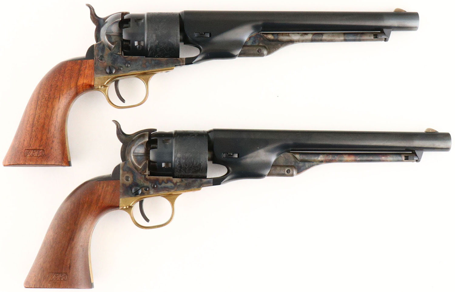 1) Colt, 1860 Army, CAL: 44, MFG: 1977, SN: US1117, Single Action Percussion Revolver, 8'' barrel. The left side of the barrel is marked ''UNITED STATES CAVALRY COMMEMORATIVE''. The top of the barrel is marked ''ADDRESS SAM L COLT HARTFORD CT''. The left side of the frame is marked in three lines ''COLTS PATENT U.S''. The left side of the trigger guard is marked ''44 CAL''. The cylinder displays a crisp Naval engagement scene. Both grips have crisp ''MJH'' cartouches. All matching SN can be found on the frame, barrel, trigger guard & butt. The wood grips are excellent. The metal blue finish on the barrel & cylinder rates 99%. The case-hardened frame, hammer & ram-rod all retain excellent case-colors. Brass trigger guard is excellent, with a thin aged patina. Bore is excellent. Small brass blade front sight.