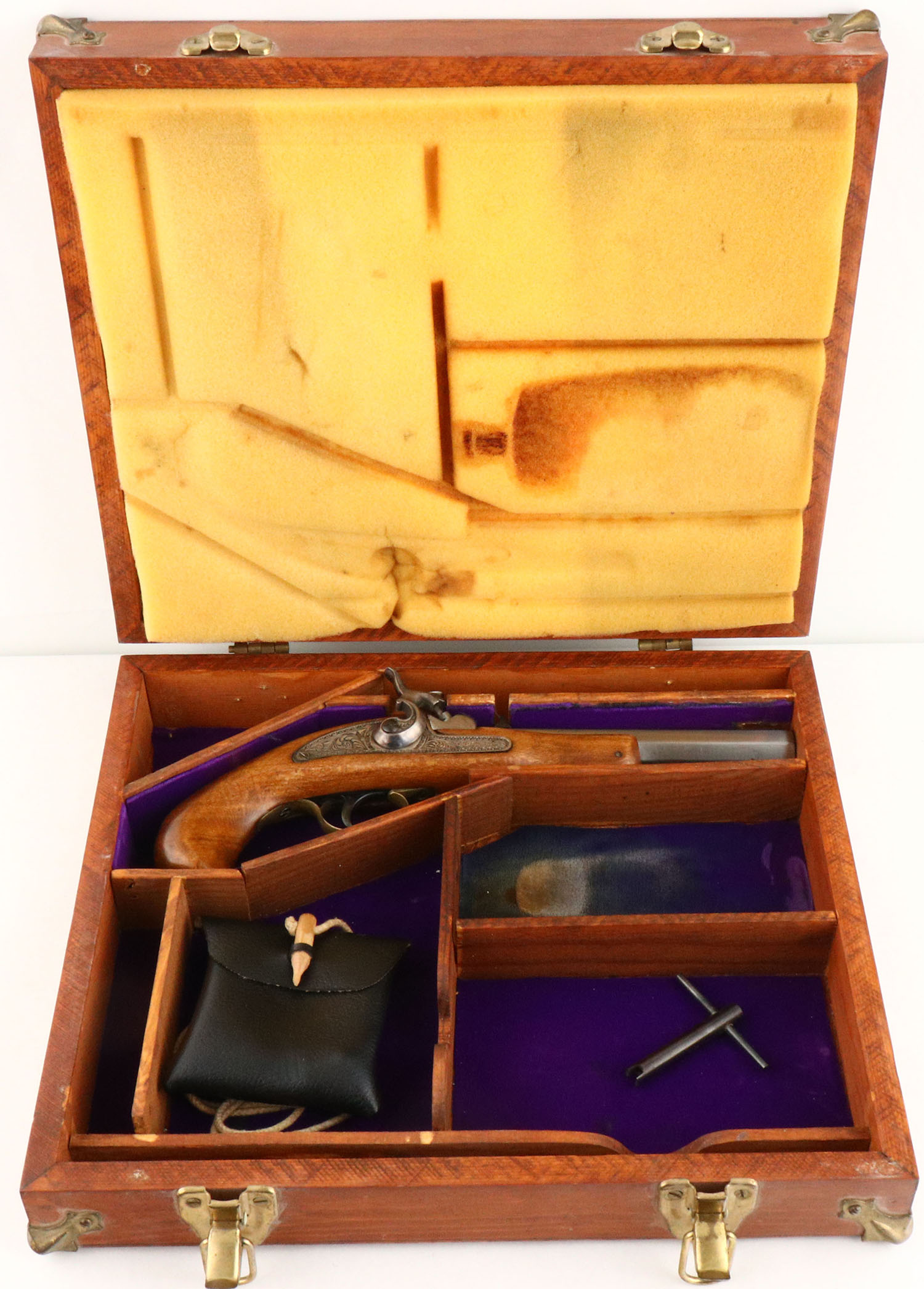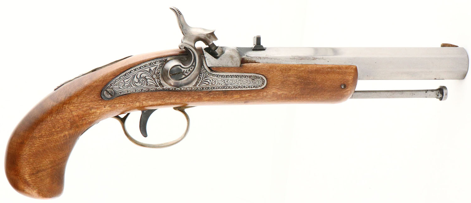 Spanish Percussion Pistol, CAL: .45, MFG: N/A, SN: NONE, Percussion Muzzleloader Pistol, 6 1/4'' barrel. The one-piece wood grip is excellent. There is an inlaid metal piece on the top of the wrist with a cabin & floral accents. The barrel has fully worn to gun metal gray. There are remnants of finish between the percussion nipple & rear sight. The side plate is fully engraved with ornamental scroll work. Bore is excellent. V-notch rear sight & small brass blade front sight. Comes in custom built wood case, with ball pouch, tool, cleaning rod/brush. Black powder, No FFL Req. - Value: 150 to 350