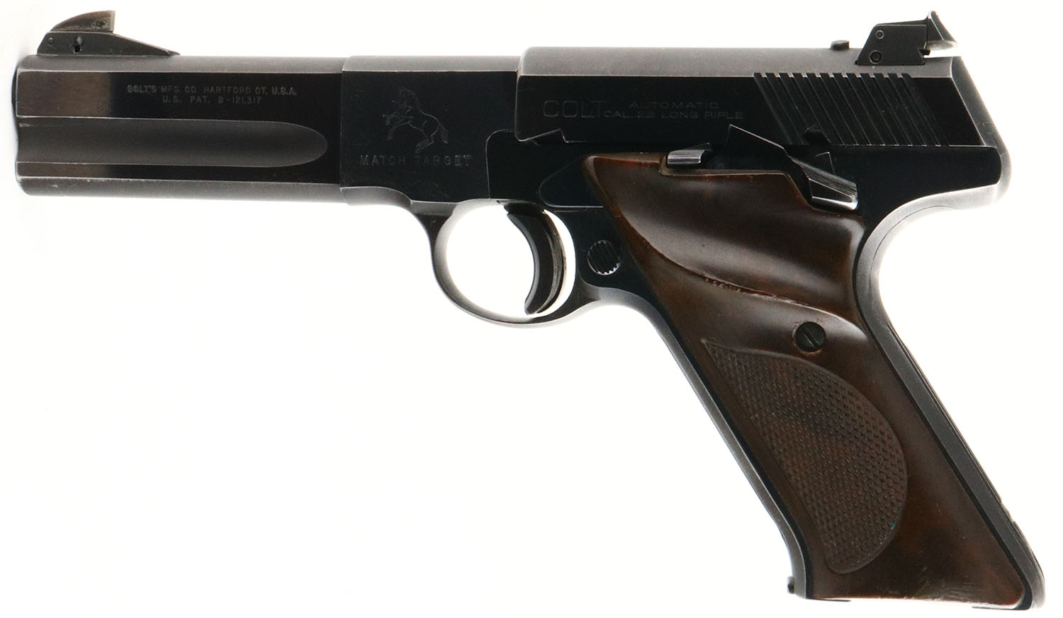 Colt, Woodsman 2nd Series Match Target, CAL: 22LR, MFG: 1952, SN: 118342-S, Semi Auto Pistol, 4 1/2'' heavy barrel. The original Colt wood checkered plastic grips are very good & solid. There are minor edge chips, scratches & scrapes. The original metal blue finish rates 90% overall, with light surface scrapes throughout & thinning around the muzzle & sharp edges. Bore is excellent. Adjustable rear sight & ramp elevated pinned blade front sight. FFL or C&R Req. - Value: 600 to 1000