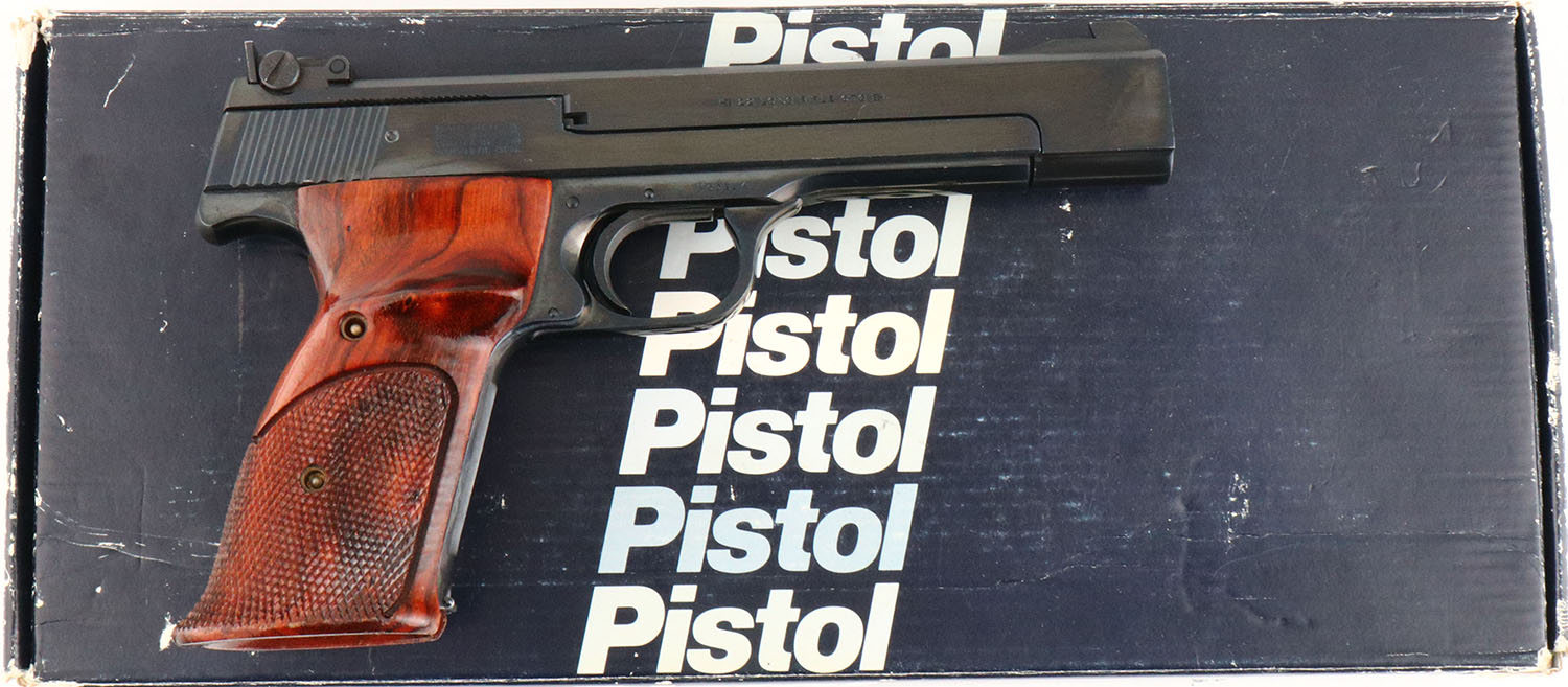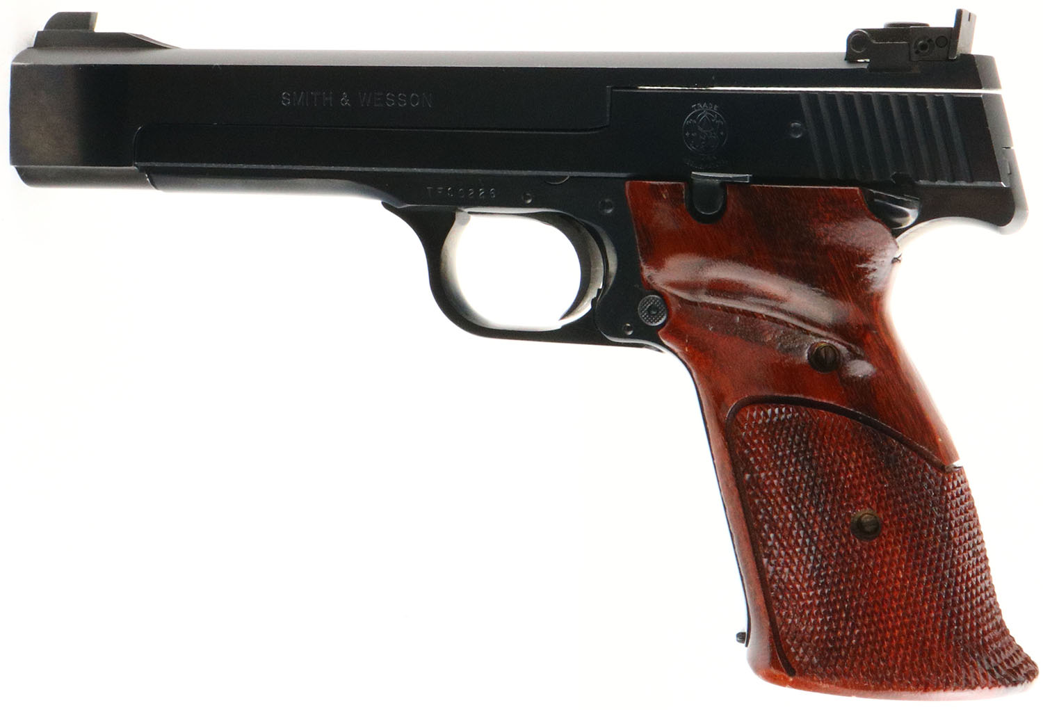 BOXED, Smith & Wesson, Model 41, CAL: 22LR, MFG: 1991, SN: TFS0226, Semi Auto Pistol, 5'' barrel. The original checkered target grips with high gloss finish, are excellent. There are minor handling & storage marks. The original metal blue finish rates 99% overall. Bore is excellent. Adjustable rear sight & ramp elevated undercut partridge front sight. Factory magazine. Comes in SN matching box, with related paperwork & original wax paper. FFL Req. - Value: 900 to 1200