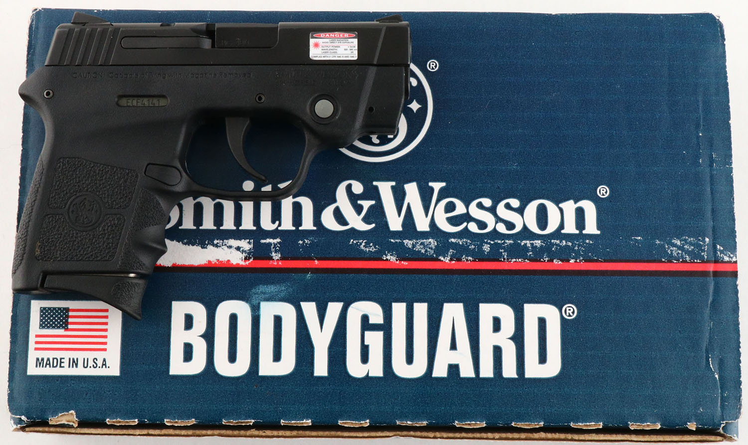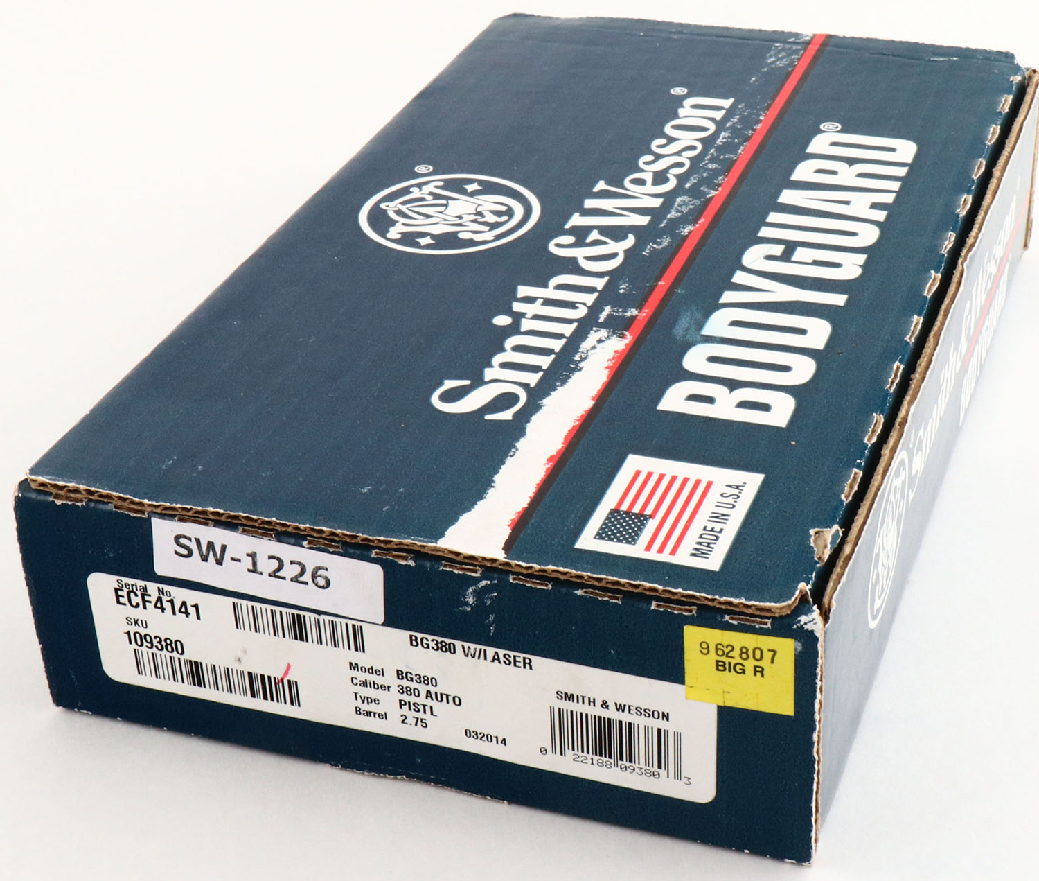 BOXED, Smith & Wesson, Bodyguard 380, CAL: 380 ACP, MFG: Modern, SN: ECF4141, Semi Auto Pistol, 2 3/4'' barrel. The S&W textured polymer grip frame is excellent. The matte black finish on the slide rates 99%. Factory laser sticker still present. Bore is excellent. Factory serrated rear & front sights. Integral Insight Laser. Comes in factory box, with related paperwork, (2) extra mags, test fire cartridge & lock. A good option for a conceal carry pistol. FFL Req. - Value: 250 to 400