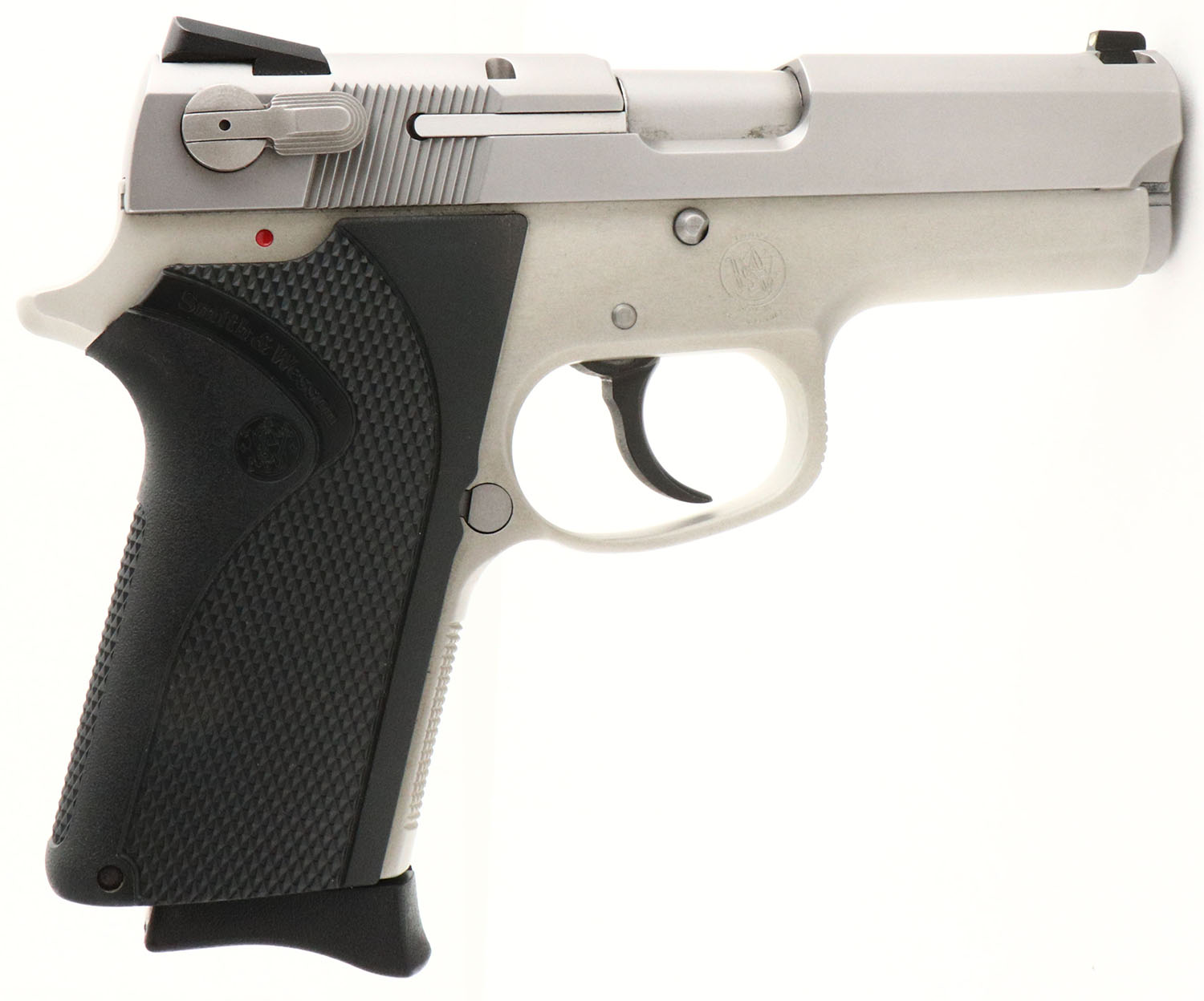 Smith & Wesson, Model 3913, CAL: 9mm, MFG: Modern, SN: VAT7536, Semi Auto Pistol, 3 1/2'' barrel. The S&W synthetic checkered grips are excellent. The stainless steel finish on the aluminum alloy frame & slide is excellent. Bore is excellent. Factory contrast sights. Factory mag. FFL Req. - Value: 450 to 600