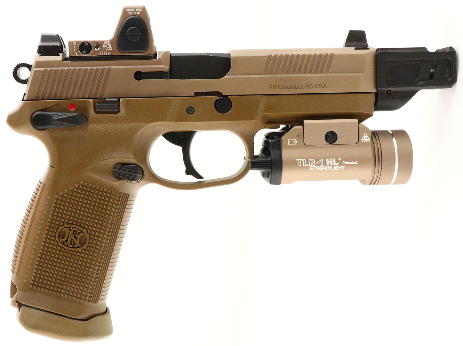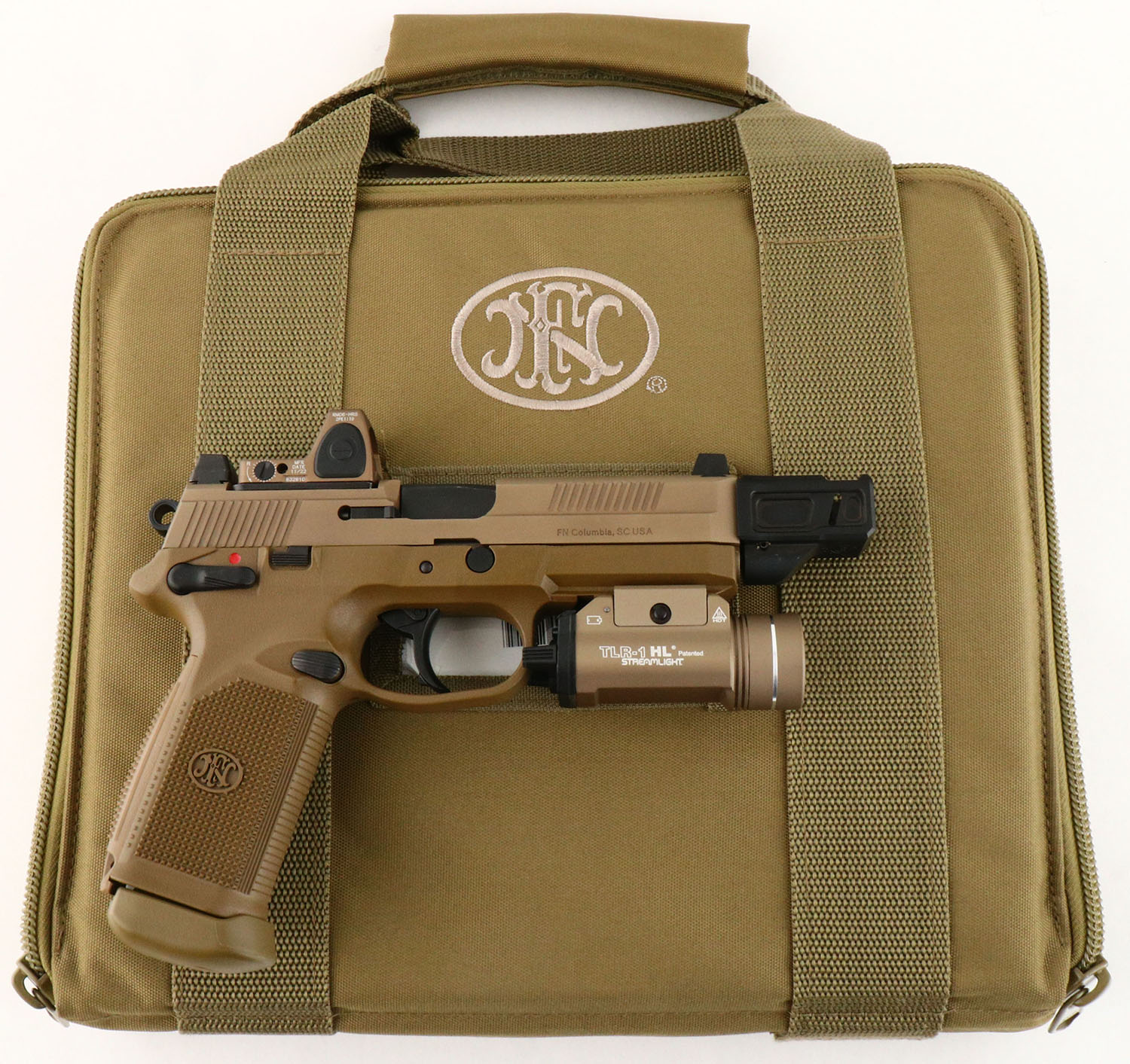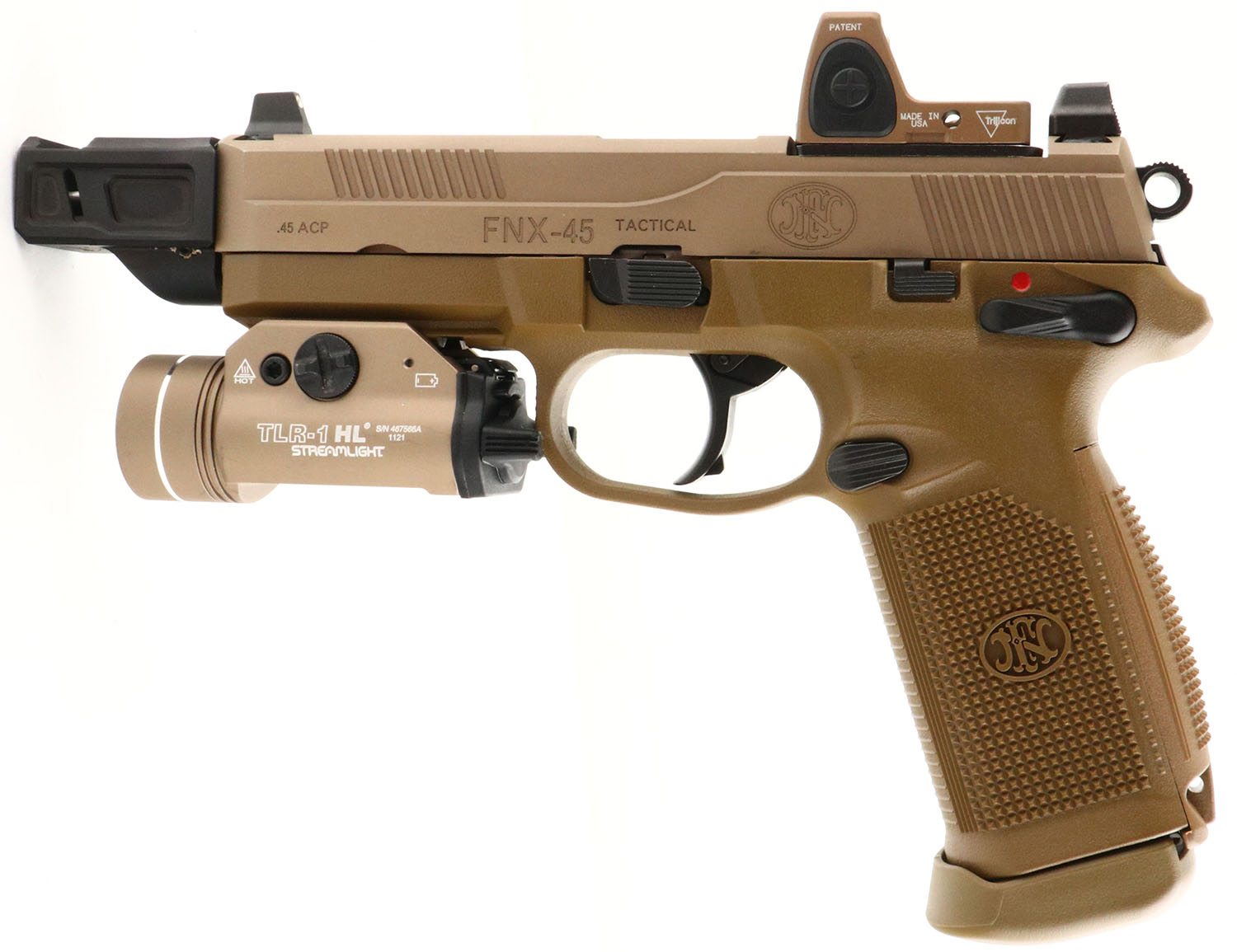 CASED, FN-USA, FNX-45 Tactical, CAL; 45 ACP, MFG: Modern, SN: FX3U111786, Semi Auto Pistol, 5 3/8'' barrel. The FDE aggressively checkered polymer grip frame is excellent. The FDE Cerakote finish on the slide is excellent, with minor handling marks. Bore is excellent. Factory night sights. Trijicon RMR Type 2 red dot sight (MSRP $795). Streamlight TLR-1 HL Tactical Flashlight (MSRP $275). Apex MRAT Compensator Kit (MSRP $175). Comes in a FN fitted, soft Cordura nylon case, with related paperwork, lock, cleaning cloth, extra grip panels, tools/oil & (5) extra mags. A complete tactical setup with high dollar accessories. FFL Req. - Value: 1500 to 2300