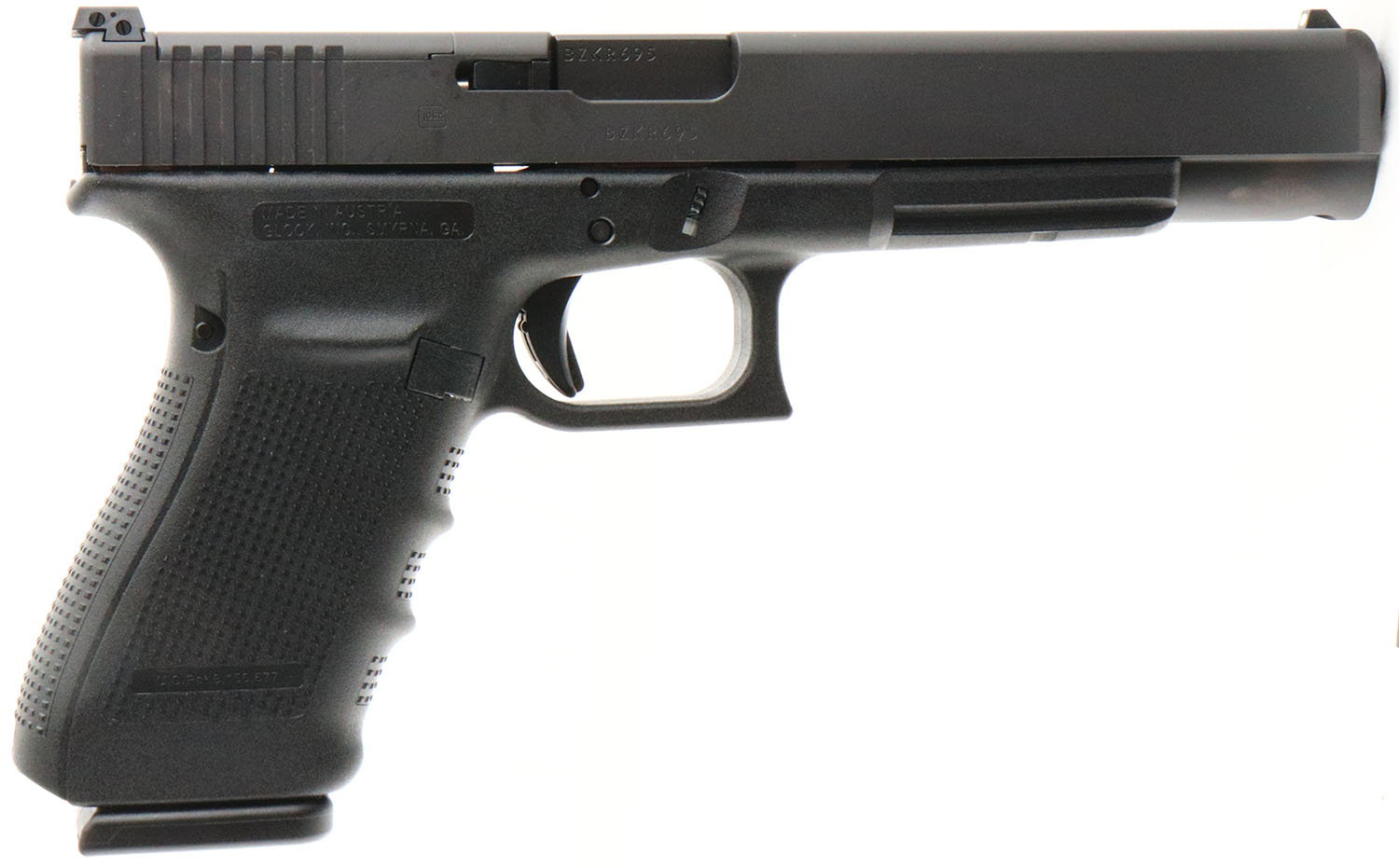NEW CASED, Glock, Model 40 Gen 4 MOS, CAL: 10mm, MFG: Modern, SN: BZKR695, Semi Auto Pistol, 6'' barrel. The textured polymer grip & frame are mint. The factory matte black finish is mint. Bore is mint. Factory square notch white rear sight & single white dot front sight. Comes in the original factory hard case, with owners manual, lock/key, cleaning rod & brush, 2 grip attachments, MOS Adapter Set 02, (3) 15rd mags & speed loader. NOS. NIB. FFL Req. - Value: 600 to 900