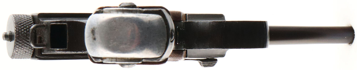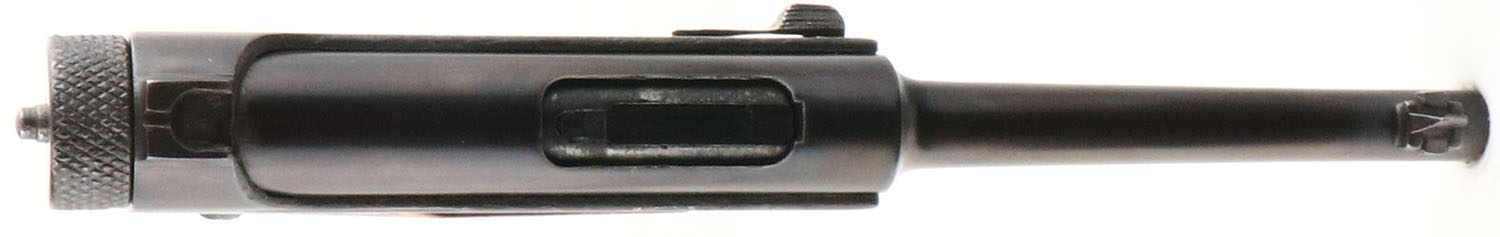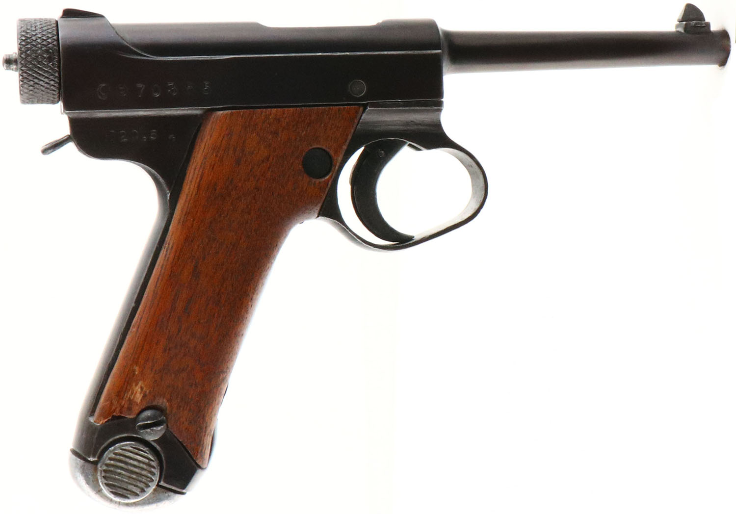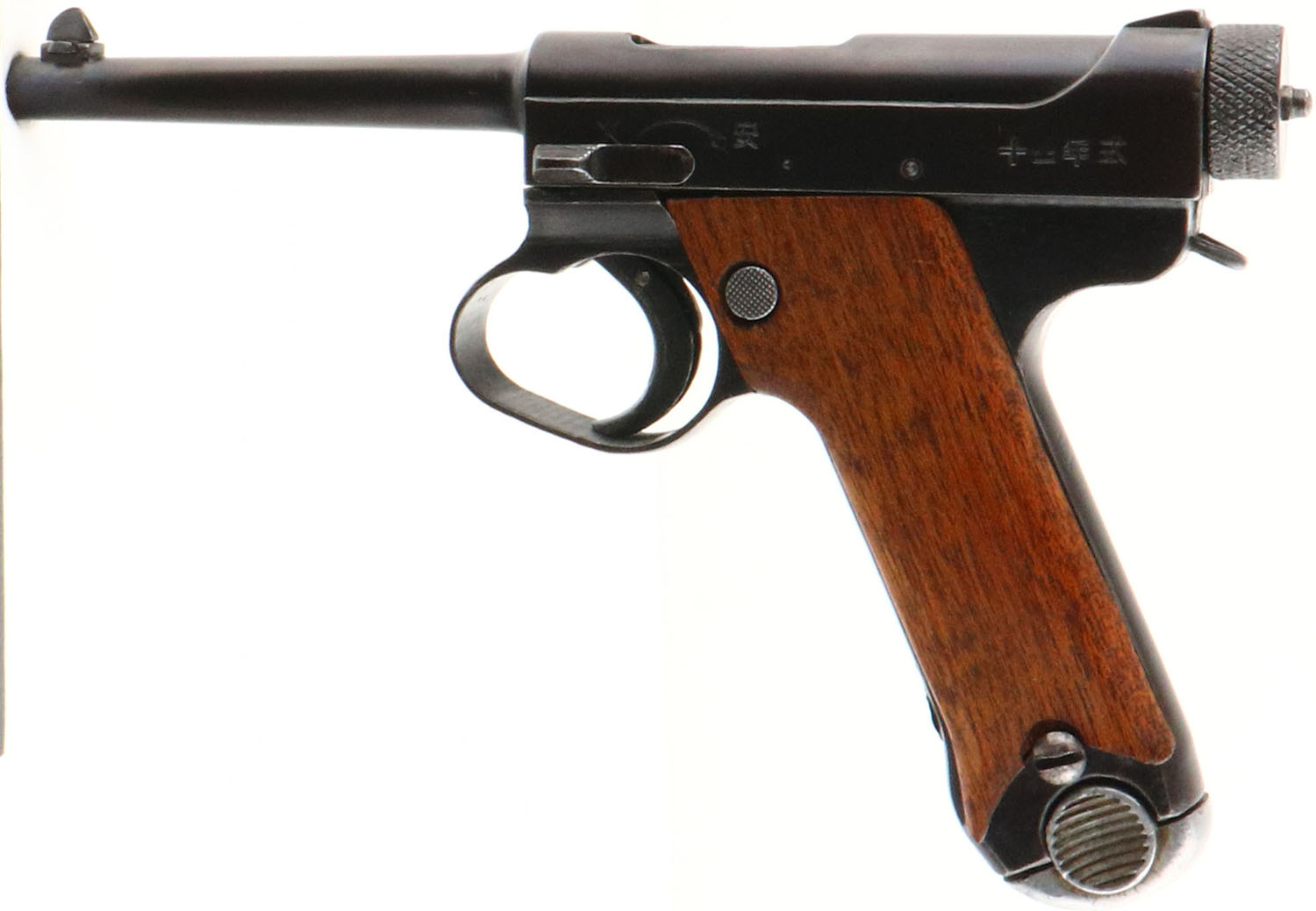 Nagoya Arsenal Toriimatsu Branch, Model: Nambu type 14, Cal: 8x22 Nambu, MFG: 1945, S/N: 70385 Serial block 2, Semi-auto pistol. 4 5/8'' barrel. The smooth wood grips are excellent with little to no wear, the right grip is loose due to the retention screw not going in all the way. The blued metal finish retains complete coverage with only light thinning & wear on the sharp edges. As such the finish rates 90%. The whole trigger guard/trigger assembly is loose & wiggles up & down in the dovetail. The sheet metal finger rest on the front strap has been hammered flat. The left side of the frame is marked with the model designation in Japanese, which reads from right to left ''TYPE 14''. The safety markings are also in Japanese, the forward position is fire, & the rearward position is safe. The right side of the frame is marked with the Nagoya Arsenal logo, a Square in a circle stamp which is there serial series mark, & means ''ro'' which is the second letter in the traditional Japanese alphabet, & then the S/N. The lower part of the right side of the frame is marked, with the Japanese character ''sho'' to designate Emperor Hirohito's reign, the date code ''20.5'', & the Japanese letter ''na'' for Nagoya, which is the final inspection mark. The bore is poor. The bore is bright with roughness, but the final half inch of the rifling is missing chunks & is chipping away. Its likely from a mix of poor MFG standards/steel, using corrosive ammo & poor maintenance. from wear & not cleaning . The barrel holds a barleycorn front sight with a square notch rear sight. Pistol comes with one 8 Rd. aluminum base magazine. There was five manufacturers that produced Type 14s, three of the manufacturers used the Nagoya arsenal mark, & two that used the Tokyo/Kokura Arsenal mark. They all were assigned different serial blocks. The Toriimatsu Branch of the Nagoya arsenal was assigned the first & second serial blocks. FFL or C&R Req. - Value: 300 to 600