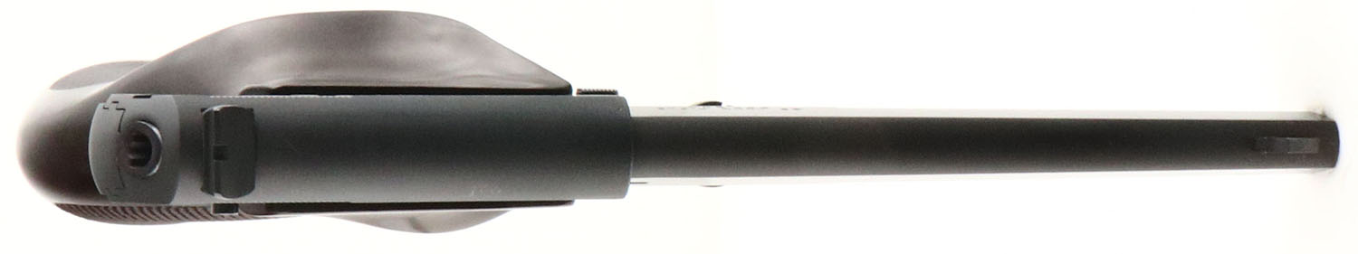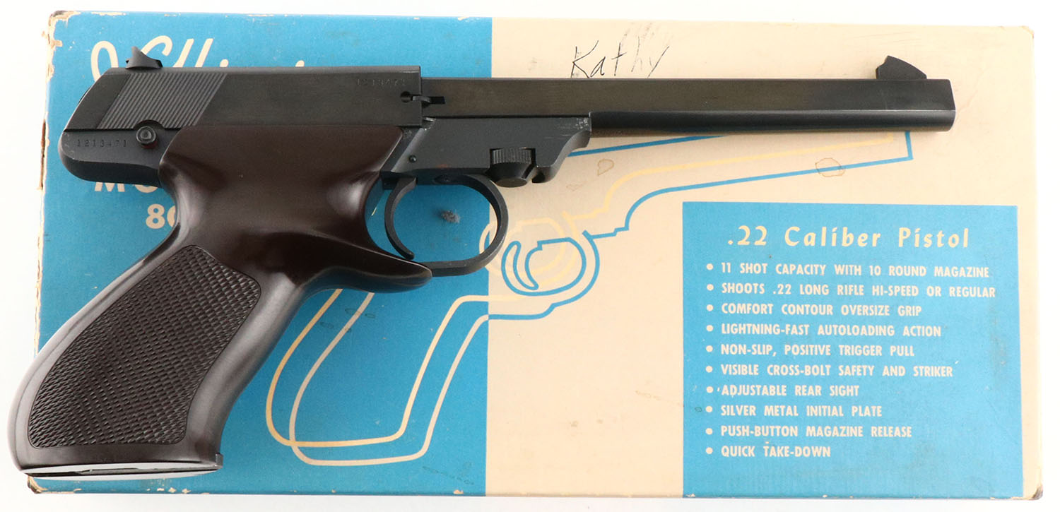 BOXED, JC Higgins, Model 80, CAL: 22LR, MFG: 1955-61, SN: 1213471, Semi Auto Pistol, 6 1/2'' barrel. The synthetic checkered target grips are excellent. The metal blue finish rates 98% overall, with an area on the right side of the barrel beginning to tone brown. Bore is excellent. Square notch rear sight & serrated blade front sight. Original magazine. Comes in factory box, with related paperwork, cleaning rod & tool. - Value: 200 to 300