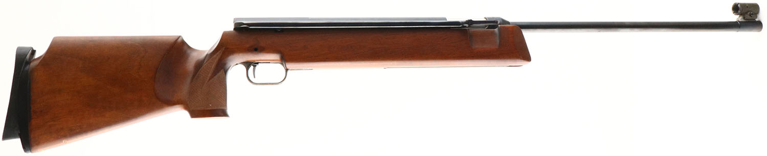 CASED, Anschutz-Match, Model 250, CAL: 4.5mm or .177, MFG: N/A, SN: 51254, Pump, 18'' barrel. The checkered & cheeked target stock is excellent. The metal blue finish rates 97% overall. Bore is excellent. Large hooded front sight. Rear sight included, but not attatched. Comes in custom wood case, with rear sight & related paperwork. Grade: Excellent. - Value: 300 to 600